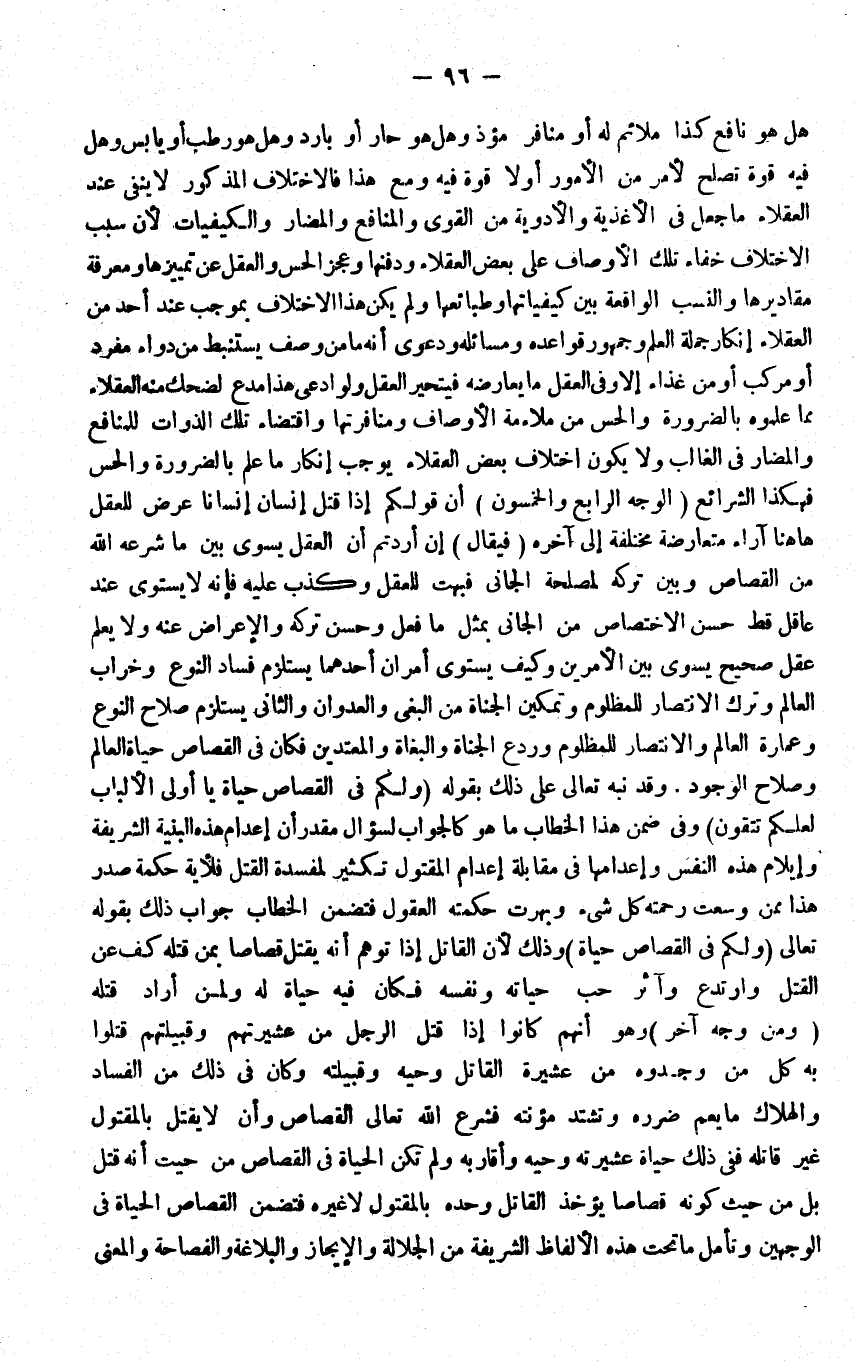 الْوَجْه الرَّابِع وَالْخَمْسُونَ أَن قَوْلكُم إِذا قتل إِنْسَان انسانا عرض لِلْعَقْلِ هَاهُنَا آراء متعارضة مُخْتَلفَة إِلَى آخِره فَيُقَال أَن أردتم أَن الْعقل يُسَوِّي بَين مَا شَرعه الله من الْقصاص وَبَين تَركه لمصْلحَة الْجَانِي فبهت لِلْعَقْلِ وَكذب عَلَيْهِ فانه لَا يَسْتَوِي عِنْد عَاقل قطّ حسن الِاخْتِصَاص من الْجَانِي بِمثل مَا فعل وَحسن تَركه والأعراض عَنهُ وَلَا يعلم عقل صَحِيح يسوى بَين الْأَمريْنِ وَكَيف يَسْتَوِي أَمْرَانِ أَحدهمَا يسْتَلْزم فَسَاد النَّوْع وخراب الْعَالم وَترك الِانْتِصَار للمظلوم وتمكين الجناة من الْبَغي والعدوان