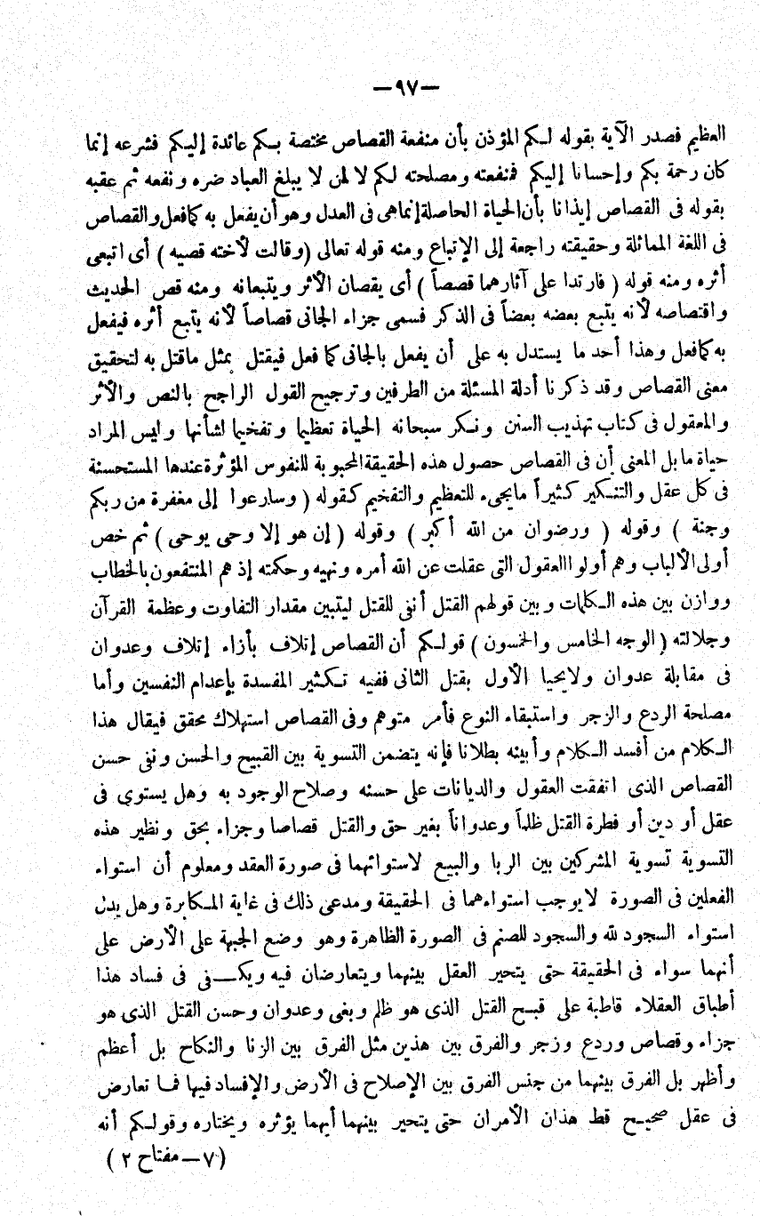 الْعَظِيم فصدر الْآيَة بقوله لكم الْمُؤَذّن بِأَن مَنْفَعَة الْقصاص مُخْتَصَّة بكم عَائِدَة إِلَيْكُم فشرعه إِنَّمَا كَانَ رَحْمَة بكم وإحسانا إِلَيْكُم فمنفعته ومصلحته لكم لَا لمن لَا يبلغ الْعباد ضره ونفعه ثمَّ عقبه بقوله فِي الْقصاص إِيذَانًا بِأَن الْحَيَاة الْحَاصِلَة إِنَّمَا هِيَ فِي الْعدْل وَهُوَ أَن يفعل بِهِ كَمَا فعل وَالْقصاص فِي اللُّغَة الْمُمَاثلَة وَحَقِيقَته رَاجِعَة إِلَى الِاتِّبَاع وَمِنْه قَوْله تَعَالَى وَقَالَت لأخته قصيه أَي اتبعي أَثَره وَمِنْه قَوْله فارتدا على آثارهما قصصا أَي يقصان الْأَثر ويتبعانه وَمِنْه قصّ الحَدِيث واقتصاصه لِأَنَّهُ يتبع بعضه بَعْضًا فِي الذّكر فَسمى جَزَاء الْجَانِي قصاصا لِأَنَّهُ يتبع أَثَره فيفعل بِهِ كَمَا فعل وَهَذَا أحد مَا يسْتَدلّ بِهِ على أَن يفعل بالجاني كَمَا فعل فَيقْتل بِمثل مَا قتل بِهِ لتحقيق معنى الْقصاص وَقد ذكرنَا أَدِلَّة الْمَسْأَلَة من الطَّرفَيْنِ وترجيح القَوْل الرَّاجِح بِالنَّصِّ والأثر والمعقول فِي كتاب تَهْذِيب السّنَن ونكر سُبْحَانَهُ الْحَيَاة تَعْظِيمًا وتفخيما لشأنها وَلَيْسَ المُرَاد حَيَاة مَا بل الْمَعْنى أَن فِي الْقصاص حُصُول هَذِه الْحَقِيقَة المحبوبة للنفوس المؤثرة عِنْدهَا المستحسنة فِي كل عقل والتنكير كثيرا مَا يَجِيء للتعظيم والتفخيم كَقَوْلِه وسارعوا إِلَى مغْفرَة من ربكُم وجنة وَقَوله ورضوان من الله أكبر وَقَوله أَن هُوَ إِلَّا وَحي يُوحى ثمَّ خص أولى الْأَلْبَاب وهم أولو الْعُقُول الَّتِي عقلت عَن الله أمره وَنَهْيه وحكمته إِذْ هم المنتفعون بِالْخِطَابِ ووازن بَين هَذِه الْكَلِمَات وَبَين قَوْلهم الْقَتْل أنفى للْقَتْل ليتبين مِقْدَار التَّفَاوُت وعظمة الْقُرْآن وجلالته