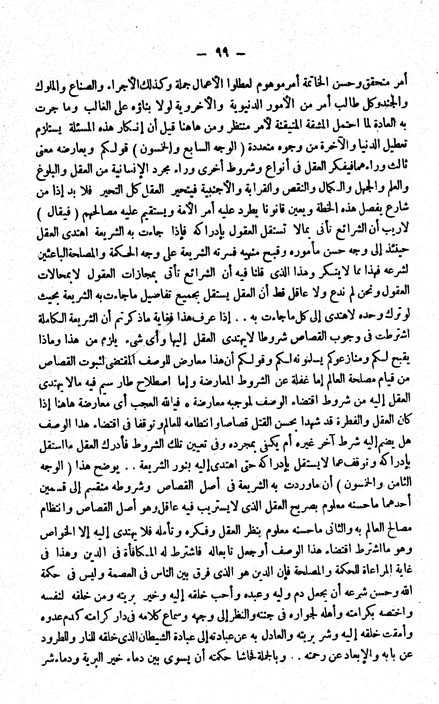 الْوَجْه السَّابِع وَالْخَمْسُونَ قَوْلكُم ويعارضه معنى ثَالِث وراءهما فيفكر الْعقل فِي انواعه وشروط أُخْرَى وَرَاء مُجَرّد الانسانية من الْعقل وَالْبُلُوغ وَالْعلم وَالْجهل والكمال وَالنَّقْص والقرابة والاجنبية فيتحير الْعقل كل التحير فَلَا بُد إِذا من شَارِع يفصل هَذِه الخطة ويعين قانونا يطرد عَلَيْهِ امْر الامة ويستقيم عَلَيْهِ مصالحهم