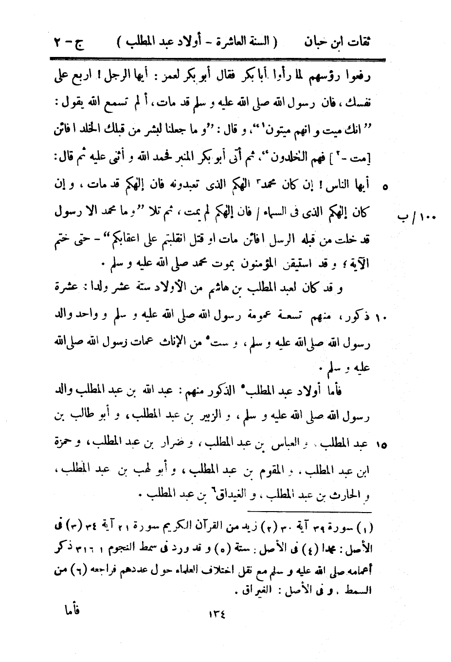 رفعوا رؤوسهم لما رَأَوْا أَبَا بكر فَقَالَ أَبُو بكر أَيهَا الرجل أَربع على نَفسك فَإِن رَسُول اللَّهِ صَلَّى اللَّهُ عَلَيْهِ وَسَلَّمَ قد مَاتَ ألم تسمع اللَّه يَقُول انك ميت وانهم ميتون وَقَالَ وَمَا جَعَلْنَا لِبَشَرٍ مِنْ قبلك الْخلد افائن مت فهم الخلدون ثمَّ أَتَى أَبُو بكر الْمِنْبَر فَحَمدَ اللَّه وَأثْنى عَلَيْهِ ثمَّ قَالَ أَيهَا النَّاس إِن كَانَ مُحَمَّد إِلَهكُم الَّذِي تعبدونه فَإِن إِلَهكُم قد مَاتَ وَإِن كَانَ إِلَهكُم الَّذِي فِي السَّمَاء فَإِن إِلَهكُم لم يمت ثمَّ تَلا وَمَا مُحَمَّدٌ إِلا رَسُولٌ قَدْ خلت من قبله الرُّسُل افائن مَاتَ أَوْ قُتِلَ انْقَلَبْتُمْ على اعقابكم حَتَّى ختم الْآيَة وَقد استيقن الْمُؤْمِنُونَ بِمَوْت مُحَمَّد صَلَّى اللَّهُ عَلَيْهِ وَسَلَّمَ وَقد كَانَ لعبد الْمطلب بْن هَاشم من الْأَوْلَاد سِتَّة عشر ولدا عشرَة ذُكُور مِنْهُم تِسْعَة عمومة رَسُول اللَّهِ صَلَّى اللَّهُ عَلَيْهِ وَسَلَّمَ وَوَاحِد وَالِد رَسُول اللَّهِ صَلَّى اللَّهُ عَلَيْهِ وَسَلَّمَ وست من الْإِنَاث عمات رَسُول اللَّهِ صَلَّى اللَّهُ عَلَيْهِ وَسَلَّمَ فَأَما أَوْلَاد عَبْد الْمطلب الذُّكُور مِنْهُم عَبْد اللَّه بْن عَبْد الْمطلب وَالِد رَسُول اللَّهِ صَلَّى اللَّهُ عَلَيْهِ وَسَلَّمَ وَالزُّبَيْر بْن عَبْد الْمطلب وَأَبُو طَالب بْن عَبْد الْمطلب وَالْعَبَّاس بْن عَبْد الْمطلب وَضِرَار بْن عَبْد الْمطلب وَحَمْزَة بْن عَبْد الْمطلب والمقوم بْن عَبْد الْمطلب وَأَبُو لَهب بْن عَبْد الْمطلب والْحَارث بْن عَبْد الْمطلب والغيداق بن عبد الْمطلب