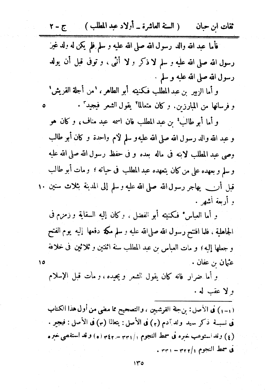 فَأَما عَبْد اللَّه وَالِد رَسُول اللَّهِ صَلَّى اللَّهُ عَلَيْهِ وَسَلَّمَ فَلم يكن لَهُ ولد غير رَسُولُ اللَّهِ صَلَّى اللَّهُ عَلَيْهِ وَسَلَّمَ لَا ذكر وَلَا أُنْثَى وَتُوفِّي قبل أَن يُولد رَسُول صَلَّى اللَّهُ عَلَيْهِ وَسَلَّمَ وَأما الزبير بْن عَبْد الْمطلب فكنيت أَبُو الطَّاهِر من أجلة القريش وفرسانها من المبارزين وَكَانَ متعالما يَقُول الشّعْر فيجيد وَأما أَبُو طَالب بْن عَبْد الْمطلب فَإِن اسْمه عَبْد منَاف وَكَانَ هُوَ وَعبد اللَّه وَالِد رَسُول اللَّهِ صَلَّى اللَّهُ عَلَيْهِ وَسَلَّمَ لأم وَاحِدَة وَكَانَ أَبُو طَالب وصّى عَبْد الْمطلب لِابْنِهِ فِي مَاله بعده وَفِي حفظ رَسُول اللَّهِ صَلَّى اللَّهُ عَلَيْهِ وَسَلَّمَ وبعهده على من كَانَ يتعهده عَبْد الْمطلب فِي حَيَاته وَمَات أَبُو طَالب قبل أَن يُهَاجر رَسُول اللَّهِ صَلَّى اللَّهُ عَلَيْهِ وَسَلَّمَ إِلَى الْمَدِينَة بِثَلَاث سِنِين وَأَرْبَعَة أشهر وَأما الْعَبَّاس فكنيته أَبُو الْفضل وَكَانَ إِلَيْهِ السِّقَايَة وزمزم فِي الْجَاهِلِيَّة فَلَمَّا افْتتح رَسُول اللَّهِ صَلَّى اللَّهُ عَلَيْهِ وَسَلَّمَ مَكَّة دَفعهَا إِلَيْهِ يَوْم الْفَتْح وَجعلهَا إِلَيْهِ وَمَات الْعَبَّاس بْن عَبْد الْمطلب سنة اثْنَتَيْنِ وَثَلَاثِينَ فِي خلَافَة عُثْمَان بْن عَفَّان وَأما ضرار فَإِنَّهُ كَانَ يَقُول الشّعْر ويجيده وَمَات قبل الْإِسْلَام وَلَا عقب لَهُ