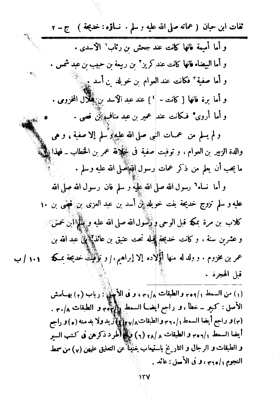 وَأما أُمَيْمَة فَإِنَّهَا كَانَت عِنْد جحش بْن رِئَاب الْأَسدي وَأما البضاء فَإِنَّهَا كَانَت عِنْد كريز بْن ربيعَة بْن حبيب بْن عَبْد شمس وَأما صَفِيَّة فَكَانَت عِنْد الْعَوام بْن خويلد بْن أَسد وَأما برة فَإِنَّهَا كَانَت عِنْد عَبْد الْأسد بْن هِلَال المَخْزُومِي وَأما أروى فَكَانَت عِنْد عُمَيْر بْن عَبْد منَاف بْن قصي وَلم يسلم من عمات النَّبِي صَلَّى اللَّهُ عَلَيْهِ وَسَلَّمَ إِلَّا صَفِيَّة وَهِي وَالِدَة الزبير بْن الْعَوام وَتوفيت صَفِيَّة فِي خلَافَة عمر بْن الْخطاب فَهَذَا مَا يجب أَن يعلم من ذكر عمات رَسُول اللَّهِ صَلَّى اللَّهُ عَلَيْهِ وَسَلَّمَ وَأما نسَاء رَسُول اللَّهِ صَلَّى اللَّهُ عَلَيْهِ وَسَلَّمَ فَإِن رَسُول اللَّهِ صَلَّى اللَّهُ عَلَيْهِ وَسَلَّمَ ويلم تزوج خَدِيجَة بنت خويلد بْن أَسد بْن عَبْد الْعُزَّى بْن قصي بْن كلاب بْن مرّة بِمَكَّة قبل الْوَحْي ورَسُول اللَّهِ صَلَّى اللَّهُ عَلَيْهِ وَسَلَّمَ بْن خمس وَعشْرين سنة وَكَانَت خَدِيجَة قبله تَحت عَتيق بْن عَائِذ بْن عَبْد اللَّه بْن عمر بْن مَخْزُوم وَولد لَهُ مِنْهَا أَوْلَاده إِلَّا إِبْرَاهِيم وَتوفيت خَدِيجَة بِمَكَّة قبل الْهِجْرَة