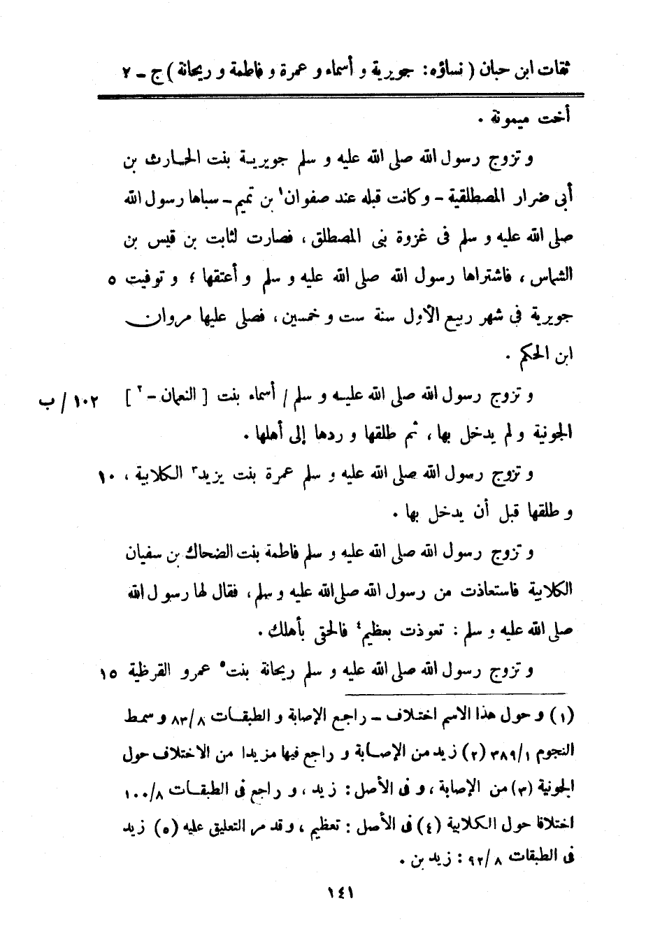 أُخْت مَيْمُونَة وَتزَوج رَسُول اللَّهِ صَلَّى اللَّهُ عَلَيْهِ وَسَلَّمَ جوَيْرِية بنت الْحَارِث بن أبي ضرار الْمُصْطَلِقِيَّة وَكَانَت قبله عِنْد صَفْوَان بْن تَمِيم سباها رَسُول اللَّهِ صَلَّى اللَّهُ عَلَيْهِ وَسَلَّمَ فِي غَزْوَة بني المصطلق فَصَارَت لِثَابِت بْن قيس بْن الشماس فاشتراها رَسُولُ اللَّهِ صَلَّى اللَّهُ عَلَيْهِ وَسَلَّمَ وأعتقها وَتوفيت جوَيْرِية فِي شهر ربيع الأول سنة سِتّ وَخمسين فصلى عَلَيْهَا مَرْوَان بْن الحكم وَتزَوج رَسُول اللَّهِ صَلَّى اللَّهُ عَلَيْهِ وَسَلَّمَ أَسمَاء بنت النُّعْمَان الْجَوْنِية وَلم يدْخل بهَا ثمَّ طَلقهَا وردهَا إِلَى أَهلهَا وَتزَوج رَسُول اللَّهِ صَلَّى اللَّهُ عَلَيْهِ وَسَلَّمَ عمْرَة بنت يزِيد الْكلابِيَّة وَطَلقهَا قبل أَن يدْخل بهَا وَتزَوج رَسُول اللَّهِ صَلَّى اللَّهُ عَلَيْهِ وَسَلَّمَ فَاطِمَة بنت الضَّحَّاك بْن سُفْيَان الْكلابِيَّة فاستعاذت من رَسُول اللَّهِ صَلَّى اللَّهُ عَلَيْهِ وَسَلَّمَ فَقَالَ لَهَا رَسُول اللَّهِ صَلَّى اللَّهُ عَلَيْهِ وَسَلَّمَ تعوذت بعظيم فألحقي بأهلك وَتزَوج رَسُولُ اللَّهِ صَلَّى اللَّهُ عَلَيْهِ وَسَلَّمَ رَيْحَانَة بنت عَمْرو القرظية