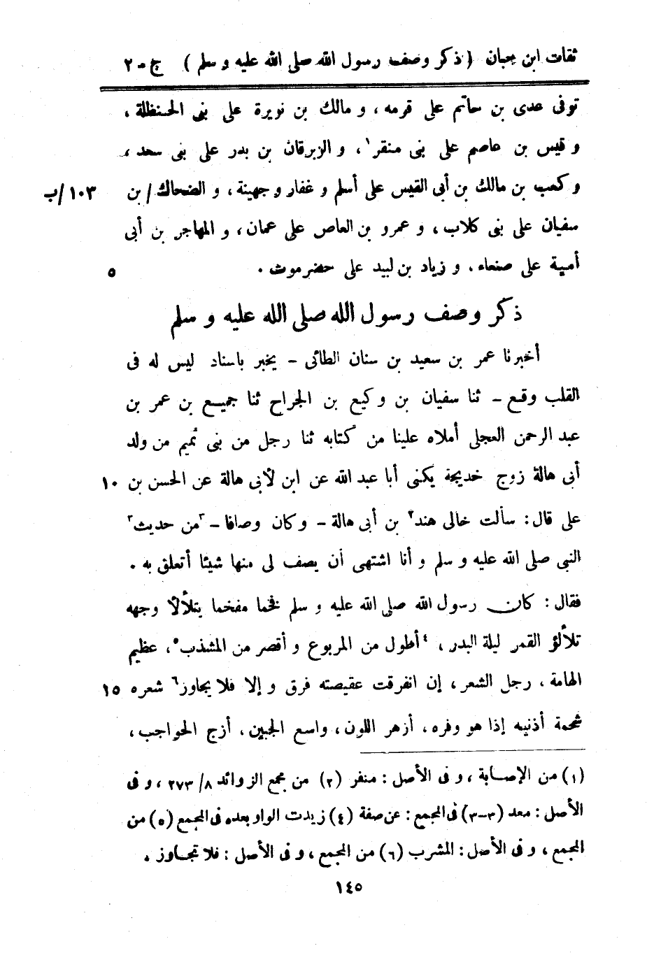 أَخْبَرَنَا عُمَرُ بْنُ سَعِيدِ بْنِ سِنَانٍ الطَّائِيُّ يُخْبِرُ بِإِسْنَادٍ لَيْسَ لَهُ فِي الْقَلْبِ وَقْعٌ ثَنَا سُفْيَانُ بْنُ وَكِيعِ بْنِ الْجَرَّاحِ ثَنَا جُمَيْعُ بْنُ عُمَرَ بْنِ عَبْدِ الرَّحْمَنِ الْعِجْلِيُّ أَمْلاهُ عَلَيْنَا مِنْ كِتَابِهِ ثَنَا رَجُلٌ مِنْ بَنِي تَمِيمٍ مِنْ وَلَدِ أَبِي هَالَةَ زَوْجِ خَدِيجَةَ يُكَنَّى أَبَا عَبْدِ الله عَن بن لأَبِي هَالَةَ عَنِ الْحَسَنِ بْنِ عَلِيٍّ قَالَ سَأَلْتُ خَالِي هِنْدَ بْنَ أَبِي هَالَةَ وَكَانَ وَصَّافًا مِنْ حَدِيثِ النَّبِيِّ صَلَّى اللَّهُ عَلَيْهِ وَسَلَّمَ وَأَنَا أَشْتَهِي أَنْ يَصِفَ لِي مِنْهَا شَيْئًا أَتَعَلَّقُ بِهِ فَقَالَ كَانَ رَسُولُ اللَّهِ صَلَّى اللَّهُ عَلَيْهِ وَسَلَّمَ فَخْمًا مُفَخَّمًا يَتَلأْلأُ وَجْهُهُ تَلأْلُؤَ الْقَمَرِ لَيْلَةَ الْبَدْرِ أَطْوَلَ مِنَ الْمَرْبُوعِ وَأَقْصَرَ مِنَ الْمُشَذَّبِ عَظِيمَ الْهَامَةِ رَجِلَ الشَّعْرِ إِنِ انْفَرَقَتْ عَقِيصَتُهُ فَرَقَ وَإِلا فَلا يُجَاوِزُ شَعْرُهُ شَحْمَةَ أُذُنَيْهِ إِذَا هُوَ وَفَّرَهُ أَزْهَرَ اللَّوْنِ وَاسِعَ الْجَبِينِ أَزَجَّ الحواجب