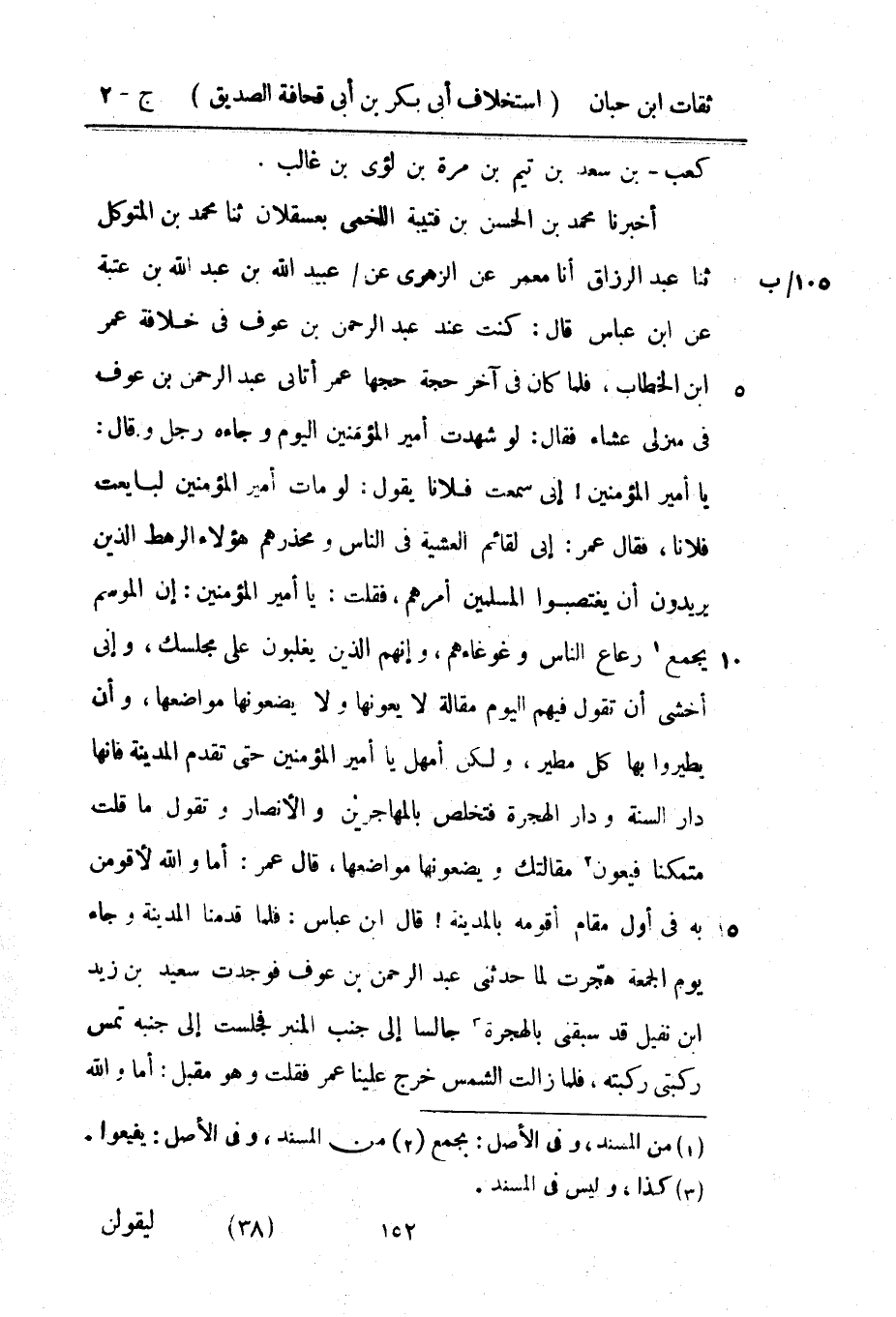 كَعْب بْن سعد بْن تيم بْن مرّة بْن لؤَي بْن غَالب أَخْبَرَنَا مُحَمَّدُ بْنُ الْحَسَنِ بْنِ قُتَيْبَةَ اللَّخْمِيُّ بِعَسْقَلانَ ثَنَا مُحَمَّدُ بْنُ الْمُتَوَكِّلِ ثَنَا عَبْدُ الرَّزَّاقِ أَنا مَعْمَرٌ عَنِ الزُّهْرِيِّ عَنْ عُبَيْدِ اللَّهِ بْنِ عَبْدِ الله بن عتبَة عَن بن عَبَّاسٍ قَالَ كُنْتُ عِنْدَ عَبْدِ الرَّحْمَنِ بْنِ عَوْفٍ فِي خِلافَةِ عُمَرَ بْنِ الْخَطَّابِ فَلَمَّا كَانَ فِي آخِرِ حَجَّةٍ حَجَّهَا عُمَرُ أَتَانِي عَبْدُ الرَّحْمَنِ بْنُ عَوْفٍ فِي مَنْزِلِي عَشَاءً فَقَالَ لَوْ شَهِدْتَ أَمِيرَ الْمُؤْمِنِينَ الْيَوْمَ وَجَاءَهُ رَجُلٌ وَقَالَ يَا أَمِيرَ الْمُؤْمِنِينَ إِنِّي سَمِعْتُ فُلانًا يَقُولُ لَوْ مَاتَ أَمِيرُ الْمُؤْمِنِينَ لَبَايَعْتُ فُلانًا فَقَالَ عُمَرُ إِنِّي لَقَائِمٌ الْعَشِيَّةَ فِي النَّاسِ وَمُحَذِّرُهُمْ هَؤُلاءِ الرَّهْطَ الَّذِينَ يُرِيدُونَ أَنْ يَغْتَصِبُوا الْمُسْلِمِينَ أَمْرَهُمْ فَقُلْتُ يَا أَمِيرَ الْمُؤْمِنِينَ إِنَّ الْمَوْسِمَ يَجْمَعُ رُعَاعَ النَّاسِ وَغَوْغَاءَهُمْ وَإِنَّهُمُ الَّذِينَ يَغْلِبُونَ عَلَى مَجْلِسِكَ وَإِنِّي أَخْشَى أَنْ تَقُولَ فِيهِمُ الْيَوْمَ مَقَالَةً لَا يَعُونَهَا وَلا يَضَعُونَهَا مَوَاضِعَهَا وَأَنْ يَطَّيَّرُوا بِهَا كُلَّ مَطِيرٍ وَلَكِنْ أَمْهِلْ يَا أَمِيرَ الْمُؤْمِنِينَ حَتَّى تَقْدَمَ الْمَدِينَةَ فَإِنَّهَا دَارُ السُّنَّةِ وَدَارُ الْهِجْرَةِ فَتَخْلُصَ بِالْمُهَاجِرِينَ وَالأَنْصَارِ وَتَقُولُ مَا قُلْتَ مُتَمَكِّنًا فَيَعُونَ مَقَالَتَكَ وَيَضَعُونَهَا مَوَاضِعَهَا قَالَ عُمَرُ أَمَا وَاللَّهِ لأَقُومَنَّ بِهِ فِي أَوَّلِ مقَام أقومه بِالْمَدِينَةِ قَالَ بن عَبَّاسٍ فَلَمَّا قَدِمْنَا الْمَدِينَةَ وَجَاءَ يَوْمُ الْجُمُعَةِ هَجَّرْتُ لَمَّا حَدَّثَنِي عَبْدُ الرَّحْمَنِ بْنُ عَوْفٍ فَوَجَدْتُ سَعِيدَ بْنَ زَيْدِ بْنِ نُفَيْلٍ قَدْ سَبَقَنِي بِالْهَجْرَةِ جَالِسًا إِلَى جَنْبِ الْمِنْبَرِ فَجَلَسْتُ إِلَى جَنْبِهِ تَمَسُّ رُكْبَتِي رُكْبَتَهُ فَلَمَّا زَالَتِ الشَّمْسُ خَرَجَ عَلَيْنَا عُمَرُ فَقُلْتُ وَهُوَ مقبل أما وَالله