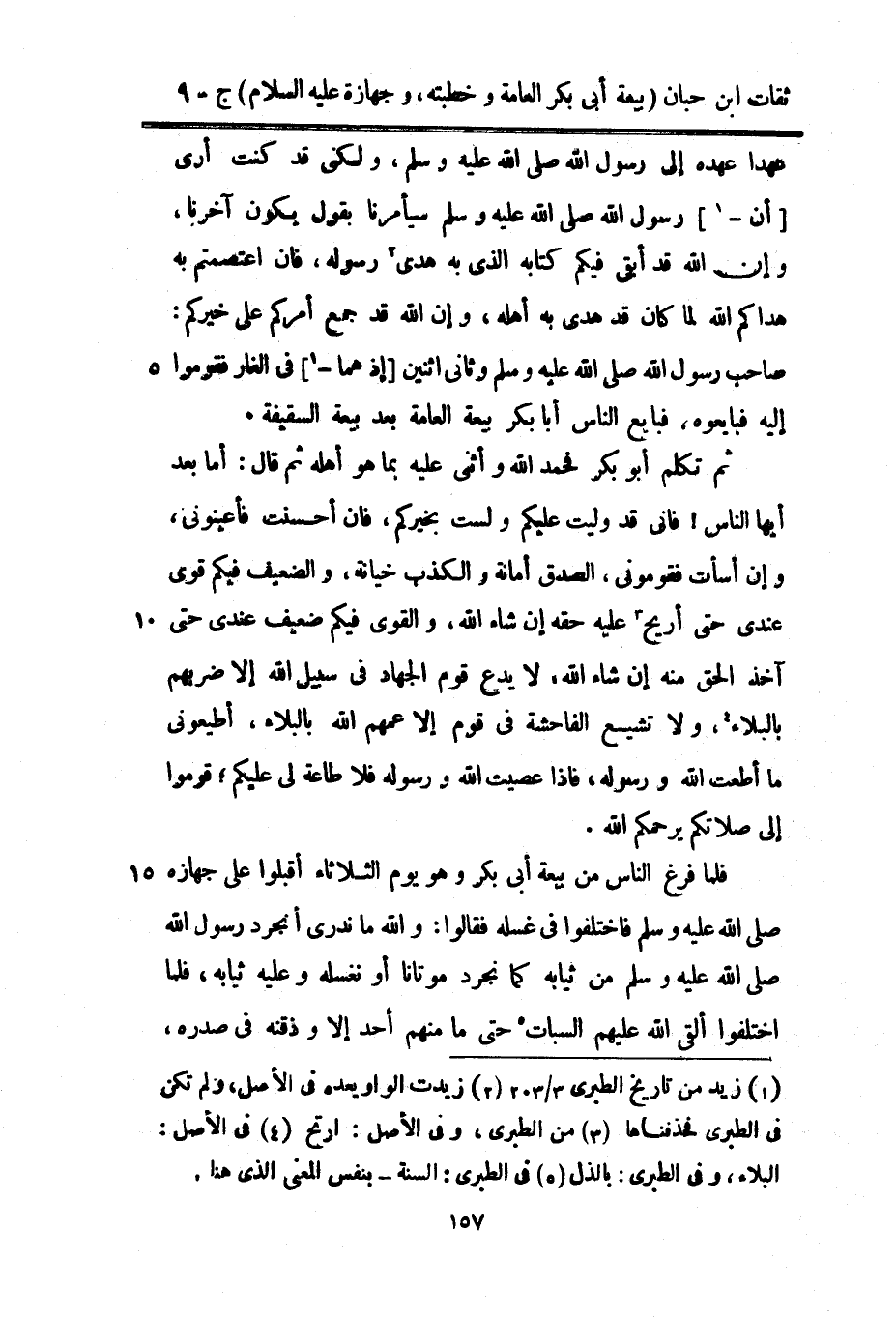 عهدا عده إِلَى رَسُول اللَّهِ صَلَّى اللَّهُ عَلَيْهِ وَسَلَّمَ وَلَكِنِّي قد كنت أرى أَن رَسُول اللَّهِ صَلَّى اللَّهُ عَلَيْهِ وَسَلَّمَ سيأمرنا بقول يكون آخِرنَا وَإِن اللَّه قد أبقى فِيكُم كِتَابه الَّذِي بِهِ هدى رَسُوله فَإِن اعْتَصَمْتُمْ بِهِ هدَاكُمْ اللَّه لما كَانَ قد هدى بِهِ أَهله وَإِن اللَّه قد جمع أَمركُم على خَيركُمْ صَاحب رَسُول اللَّهِ صَلَّى اللَّهُ عَلَيْهِ وَسَلَّمَ وَثَانِي اثْنَيْنِ إِذْ هما فِي الْغَار فَقومُوا إِلَيْهِ فَبَايعُوهُ فَبَايع النَّاس أَبَا بكر بيعَة الْعَامَّة بعد بيعَة السَّقِيفَة ثمَّ تكلم أَبُو بكر فَحَمدَ اللَّهَ وَأَثْنَى عَلَيْهِ بِمَا هُوَ أَهْلُهُ ثُمَّ قَالَ أَمَّا بَعْدُ أَيهَا النَّاس فَإِنِّي قد وليت عَلَيْكُم وَلست بِخَيْرِكُمْ فَإِن أَحْسَنت فَأَعِينُونِي وَإِن أَسَأْت فقوموني الصدْق أَمَانَة وَالْكذب خِيَانَة والضعيف فِيكُم قوى عِنْدِي حَتَّى أُرِيح عَلَيْهِ حَقه إِن شَاءَ اللَّه والقوى فِيكُم ضَعِيف عِنْدِي حَتَّى آخذ الْحق مِنْهُ إِن شَاءَ اللَّه لَا يدع قوم الْجِهَاد فِي سَبِيل اللَّه إِلَّا ضَربهمْ بالبلاء وَلَا تشيع الْفَاحِشَة فِي قوم إِلَّا عمهم اللَّه بالبلاء أَطِيعُونِي مَا أَطَعْت اللَّه وَرَسُوله فَإِذا عصيت اللَّه وَرَسُوله فَلَا طَاعَة لي عَلَيْكُم قومُوا إِلَى صَلَاتكُمْ يَرْحَمكُمْ اللَّه فَلَمَّا فرغ النَّاس من بيعَة أبي بكر وَهُوَ يَوْم الثُّلَاثَاء أَقبلُوا على جهازه صَلَّى اللَّهُ عَلَيْهِ وَسَلَّمَ فَاخْتَلَفُوا فِي غسله فَقَالُوا وَالله مَا نَدْرِي أنجرد رَسُول اللَّهِ صَلَّى الله عَلَيْهِ وَسلم من ثيابهكما نجرد مَوتَانا أَو نغسله وَعَلِيهِ ثِيَابه فَلَمَّا اخْتلفُوا ألْقى اللَّه عَلَيْهِم السبات حَتَّى مَا مِنْهُم أحد إِلَّا وذقنه فِي صَدره