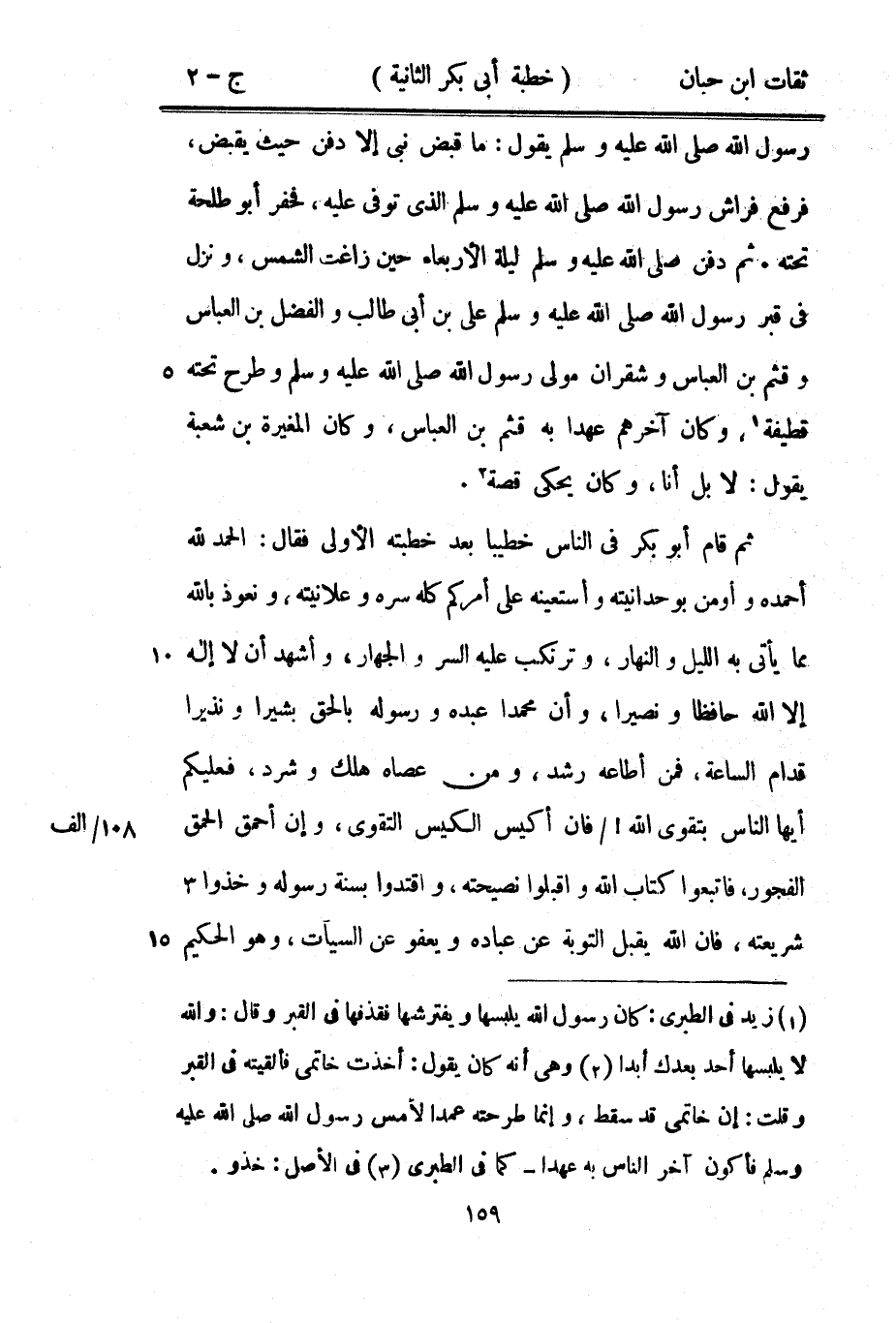 رَسُولُ اللَّهِ صَلَّى اللَّهُ عَلَيْهِ وَسَلَّمَ يَقُول مَا قبض نَبِي إِلَّا دفن حَيْثُ يقبض فَرفع فرَاش رَسُول اللَّهِ صَلَّى اللَّهُ عَلَيْهِ وَسَلَّمَ الَّذِي توفّي عَلَيْهِ فحفر أَبُو طَلْحَة تَحْتَهُ ثمَّ دفن صَلَّى اللَّهُ عَلَيْهِ وَسَلَّمَ لَيْلَة الْأَرْبَعَاء حِين زاغت الشَّمْس وَنزل فِي قبر رَسُول اللَّهِ صَلَّى اللَّهُ عَلَيْهِ وَسَلَّمَ على بْن أبي طَالب وَالْفضل بْن الْعَبَّاس وَقثم بْن الْعَبَّاس وشقران مولى رَسُول اللَّهِ صَلَّى اللَّهُ عَلَيْهِ وَسَلَّمَ وَطرح تَحْتَهُ قطيفة وَكَانَ آخِرهم عهدا بِهِ قثم بْن الْعَبَّاس وَكَانَ الْمُغيرَة بْن شُعْبَة يَقُول لَا بل أَنا وَكَانَ يحْكى قصَّة ثمَّ قَامَ أَبُو بكر فِي النَّاس خَطِيبًا بعد خطبَته الأولى فَقَالَ الْحَمد لله حَمده وأومن بوحدانيته وَأَسْتَعِينهُ على أَمركُم كُله سره وعلانيته ونعوذ بِاللَّه مِمَّا يَأْتِي بِهِ اللَّيْل وَالنَّهَار وترتكب عَلَيْهِ السِّرّ والجهار وَأشْهد أَن لَا إِلَه إِلَّا اللَّه حَافِظًا ونصيرا وَأَن مُحَمَّدًا عَبده وَرَسُوله بِالْحَقِّ بشيرا وَنَذِيرا قُدَّام السَّاعَة فَمن أطاعه رشد وَمن عَصَاهُ هلك وشرد فَعَلَيْكُم أَيهَا النَّاس بتقوى اللَّه فَإِن أَكيس الْكيس التَّقْوَى وَإِن أَحمَق الْحمق الْفُجُور فاتبعوا كتاب اللَّه واقبلوا نصيحته وَاقْتَدوا بِسنة رَسُوله وخذوا شَرِيعَته فَإِن اللَّه يقبل التَّوْبَة عَن عباده وَيَعْفُو عَن السيآت وَهُوَ الْحَكِيم