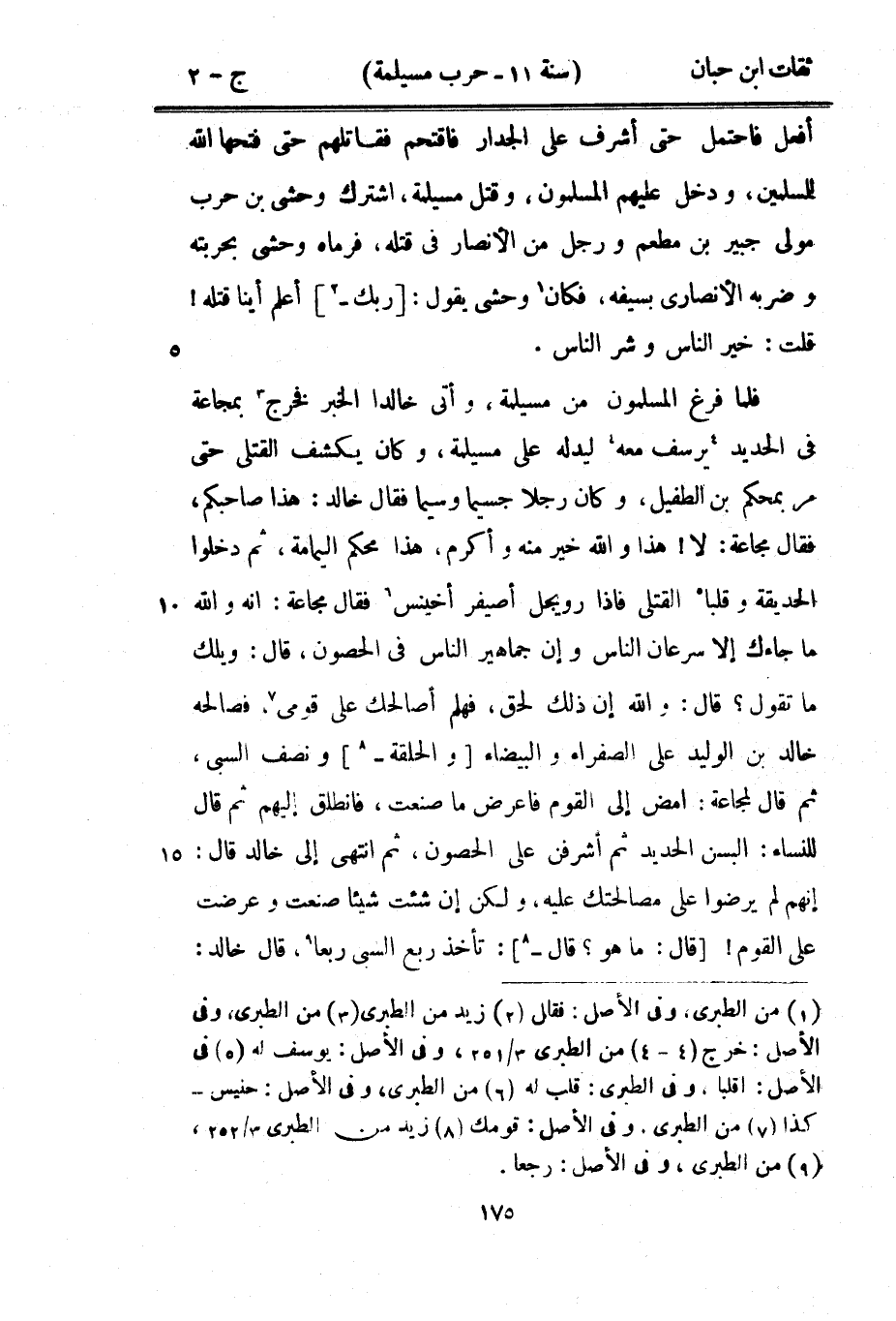 أفعل فَاحْتمل حَتَّى أشرف على الْجِدَار فاقتحم فَقَاتلهُمْ حَتَّى فتحهَا اللَّه للْمُسلمين وَدخل عَلَيْهِم الْمُسلمُونَ وَقتل مُسَيْلمَة اشْترك وَحشِي بْن حَرْب مولى جُبَير بْن مطعم وَرجل من الْأَنْصَار فِي قَتله فَرَمَاهُ وَحشِي بحربته وضربه الْأنْصَارِيّ بِسَيْفِهِ فَكَانَ وَحشِي يَقُول رَبك أعلم أَيّنَا قَتله قلت خير النَّاس وَشر النَّاس فَلَمَّا فرغ الْمُسلمُونَ من مُسَيْلمَة وأتى خَالِدا الْخَبَر فَخرج بمجاعة فِي الْحَدِيد يرسف مَعَه ليدله على مُسَيْلمَة وَكَانَ يكْشف الْقَتْلَى حَتَّى مر بمحكم بْن الطُّفَيْل وَكَانَ رجلا جسيما وسيما فَقَالَ خَالِد هَذَا صَاحبكُم فَقَالَ مجاعَة لَا هَذَا وَالله خير مِنْهُ وَأكْرم هَذَا مُحكم الْيَمَامَة ثمَّ دخلُوا الحديقة وَقَلْبًا الْقَتْلَى فَإِذا رويجل أصيفر أخينس فَقَالَ مجاعَة انه وَالله مَا جَاءَك إِلَّا سرعَان النَّاس فِي الْحُصُون قَالَ وَيلك مَا تَقول قَالَ وَالله إِن ذَلِك لحق فَهَلُمَّ أصالحك على قومِي فَصَالحه خَالِد بْن الْوَلِيد على الصَّفْرَاء والبيضاء وَالْحَلقَة وَنصف السَّبي ثمَّ قَالَ لمجاعة امْضِ إِلَى الْقَوْم فاعرض مَا صنعت فَانْطَلق إِلَيْهِم ثمَّ قَالَ للنِّسَاء البسن الْحَدِيد ثمَّ أشرفن على الْحُصُون ثمَّ انْتهى إِلَى خَالِد قَالَ إِنَّهُم لم يرْضوا على مصالحتك عَلَيْهِ وَلَكِن إِن شِئْت شَيْئا صنعت وَعرضت على الْقَوْم قَالَ مَا هُوَ قَالَ تَأْخُذ ربع السَّبي ربعا قَالَ خَالِد