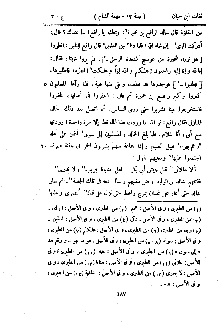 من الْمَفَازَة قَالَ خَالِد لرافع بْن عميرَة وَيحك يَا رَافع مَا عنْدك قَالَ أدْركْت الرّيّ إِن شَاءَ اللَّه فَلَمَّا دنا من العلمين قَالَ رَافع للنَّاس انْظُرُوا هَل ترَوْنَ شجيرة من عوسج كعقدة الرجل فَلم يرَوا شَيْئا فَقَالَ أَنا لله وَأَنا إِلَيْهِ رَاجِعُون هلكتم وَالله إِذا وَهَلَكت انْظُرُوا فاطلبوها فطلبوا فوجدوها قد قطعت وَبَقِي مِنْهَا بَقِيَّة فَلَمَّا رَآهَا الْمُسلمُونَ كبروا وَكبر رَافع بْن عميرَة ثمَّ قَالَ احفروا فِي أَصْلهَا فَحَفَرُوا فَاسْتَخْرَجُوا عينا فَشَرِبُوا حَتَّى رُوِيَ النَّاس ثمَّ اتَّصل بعد ذَلِك لخَالِد الْمنَازل فَقَالَ رَافع فوَاللَّه مَا وَردت هَذَا المَاء قطّ إِلَّا مرّة وَاحِدَة وردتها مَعَ أَبى وَأَنا غُلَام فَلَمَّا بلغ لخَالِد والمسلمون إِلَى سوى أغار على أَهله وهم بهراء قبيل الصُّبْح وَإِذا جمَاعَة مِنْهُم يشربون الْخمر فِي جَفْنَة لَهُم قد اجْتَمعُوا عَلَيْهَا ومغنيهم يَقُول أَلا عللاني قبل جَيش أبي بكر لَعَلَّ منايانا قريب وَلَا نَدْرِي فَقَتلهُمْ خَالِد بْن الْوَلِيد وَقتل مغنيهم وسال دَمه فِي تِلْكَ الْجَفْنَة ثمَّ سَار خَالِد حَتَّى أغار على غَسَّان بمرج راهط حَتَّى نزل على قناة بصرى وَعَلَيْهَا