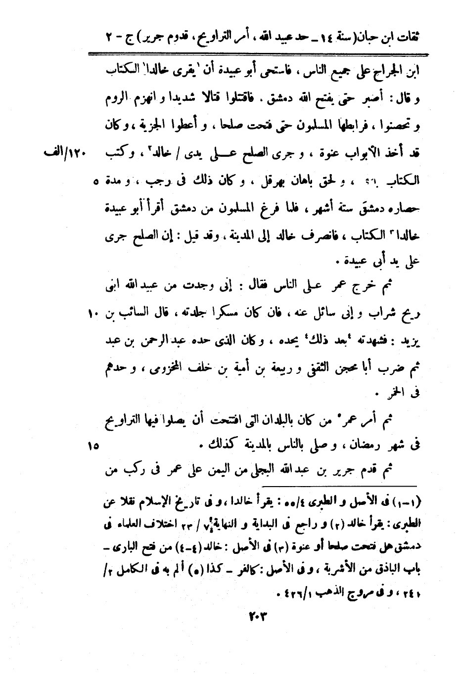 بْن الْجراح على جَمِيع النَّاس فاستحى أَبُو عُبَيْدَة أَن يقري خَالِدا الْكتاب وَقَالَ أَصْبِر حَتَّى يفتح اللَّه دمشق فَاقْتَتلُوا قتالا شَدِيدا وَانْهَزَمَ الرّوم وتحصنوا فرابطها الْمُسلمُونَ حَتَّى فتحت صلحا وأعطوا الْجِزْيَة وَكَانَ قد أَخذ الْأَبْوَاب عنْوَة وَجرى الصُّلْح على يَدي خَالِد وَكتب الْكتاب وَلحق باهان بهرقل وَكَانَ ذَلِك فِي رَجَب وَمُدَّة حصاره دمشق سِتَّة أشهر فَلَمَّا فرغ الْمُسلمُونَ من دمشق أَقرَأ أَبُو عُبَيْدَة خَالِدا الْكتاب فَانْصَرف خَالِد إِلَى الْمَدِينَة وَقد قيل إِن الصُّلْح جرى على يَد أبي عُبَيْدَة ثمَّ خرج عمر على النَّاس فَقَالَ إِنِّي وجدت من عبيد اللَّه ابْني ريح شراب وَإِنِّي سَائل عَنهُ فَإِن كَانَ مُسكرا جلدته قَالَ السَّائِب بْن يزِيد فشهدته بعد ذَلِك يحده وَكَانَ الَّذِي حَده عَبْد الرَّحْمَن بْن عَبْد ثمَّ ضرب أَبَا محجن الثقفى وَرَبِيعَة بْن أُميَّة بْن خلف المَخْزُومِي وحدهم فِي الْخمر ثمَّ أَمر عدمر من كَانَ بالبلدان الَّتِي افتتحت أَن يصلوا فِيهَا التَّرَاوِيح فِي شهر رَمَضَان وَصلى بِالنَّاسِ بِالْمَدِينَةِ كَذَلِك ثمَّ قدم جرير بْن عَبْد اللَّه البَجلِيّ من الْيمن على عمر فِي ركب من