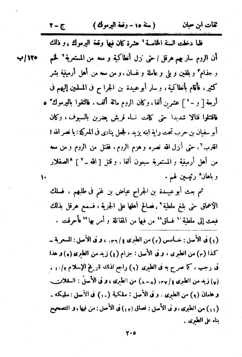 فَلَمَّا دخلت السّنة الْخَامِسَة عشرَة كَانَ فِيهَا وقْعَة اليرموك وَذَلِكَ أَن الرّوم سَار بهم هِرقل حَتَّى نزل أنطاكية وَمَعَهُ من المستعربة لخم وجذام وبلقين وبلي وعاملة وغسان وَمن مَعَه من أهل أرمينية بشر كثير فَأَقَامَ بأنطاكية وَسَار أَبُو عُبَيْدَة بْن الْجراح فِي الْمُسلمين إِلَيْهِم فِي أَرْبَعَة وَعشْرين ألفا وَكَانَ الرّوم مائَة ألف فَالْتَقوا باليرموك فَاقْتَتلُوا قتالا شَدِيدا حَتَّى كَانَت نسَاء قُرَيْش يضربن باتلسيوف وَكَانَ أَبُو سُفْيَان بْن حَرْب تَحت راية ابْنه يزِيد فَجعل يُنَادي فِي المعركة يَا نصر اللَّه اقْترب حَتَّى أنزل اللَّه نَصره وَهزمَ الرّوم فَقتل من الرّوم وَمن مَعَه من أهل أرمينية والمستعربة سَبْعُونَ ألفا وَقتل اللَّه الصقلار وباهان رئيسين لَهُم ثمَّ بعث أَبُو عُبَيْدَة بْن الْجراح عِيَاض بْن غنم فِي طَلَبهمْ فسلك الأعماق حَتَّى بلغ ملطية فَصَالح أَهلهَا على الْجِزْيَة فَسمع هِرقل بذلك فَبعث إِلَى ملطية فساق من فِيهَا من الْمُقَاتلَة وَأمر بهَا فأحرقت