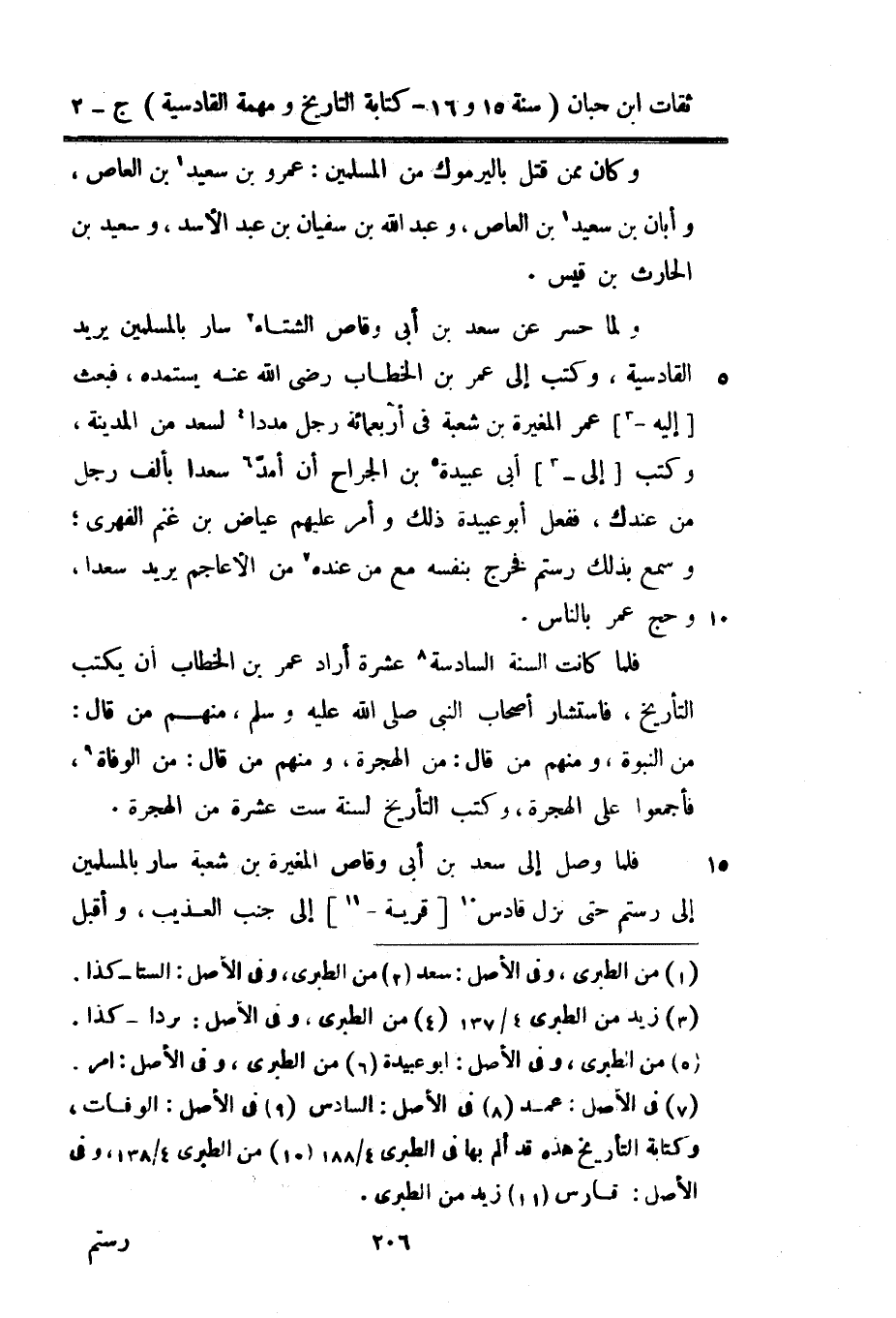 وَكَانَ مِمَّن قتل باليرموك من الْمُسلمين عَمْرو بْن سعيد بْن الْعَاصِ وَأَبَان بْن سعيد بْن الْعَاصِ وَعبد اللَّه بْن سُفْيَان بْن عَبْد الْأسد وَسَعِيد بْن الْحَارِث بْن قيس وَلما حسر عَن سعد بْن أَبِي وَقاص الشتَاء سَار بِالْمُسْلِمين يُرِيد الْقَادِسِيَّة وَكتب إِلَى عمر بْن الْخطاب رَضِي اللَّه عَنهُ يستمده فَبعث إِلَيْهِ عمر الْمُغيرَة بْن شُعْبَة فِي أَرْبَعمِائَة رجل مدَدا لسعد من الْمَدِينَة وَكتب إِلَى أبي عُبَيْدَة بْن الْجراح أَن أمد سَعْدا بِأَلف رجل من عنْدك فَفعل أَبُو عُبَيْدَة ذَلِك وَأمر عَلَيْهِم عِيَاض بْن غنم الفِهري وَسمع بذلك رستم فَخرج بِنَفسِهِ مَعَ من عِنْده من الْأَعَاجِم يُرِيد سَعْدا وَحج عمر بِالنَّاسِ فَلَمَّا كَانَت السّنة السَّادِسَة عشرَة أَرَادَ عمر بن الْخطاب أَن يكْتب التأريخ فَاسْتَشَارَ أَصْحَاب النَّبِيَّ صَلَّى اللَّهُ عَلَيْهِ وَسَلَّمَ مِنْهُم من قَالَ من النُّبُوَّة وَمِنْهُم من قَالَ من الْهِجْرَة وَمِنْهُم من قَالَ من الْوَفَاة فَأَجْمعُوا على الْهِجْرَة وَكتب التَّارِيخ لسنة سِتّ عشرَة من الْهِجْرَة فَلَمَّا وصل إِلَى سعد بْن أبي وَقاص الْمُغيرَة بْن شُعْبَة سَار بِالْمُسْلِمين إِلَى رستم حَتَّى نزل قادس قَرْيَة إِلَى جنب العذيب وَأَقْبل