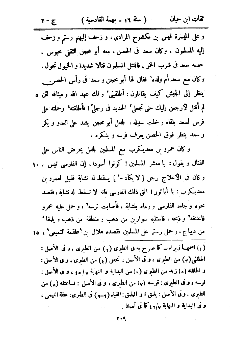 وعَلى الميسرة قيس بْن مكشوح الْمرَادِي وزحف إِلَيْهِم رستم وزحف إِلَيْهِ الْمُسلمُونَ وَكَانَ سعد فِي الْحصن مَعَه أَبُو محجن الثَّقَفِيّ مَحْبُوس حَبسه سعد فِي شرب الْخمر فاقتتل الْمُسلمُونَ قتالا شَدِيدا والخيول تجول وَكَانَ مَعَ سعد أم وَلَده فَقَالَ لَهَا أَبُو محجن وَسعد فِي راس الْحصن ينظر إِلَى الْجَيْش كَيفَ يُقَاتلُون أطلقيني وَلَك عهد اللَّه وميثاقه لَئِن لم أقتل لأرجعن إِلَيْك حَتَّى تجعلي الْحَدِيد فِي رجْلي فأطلقته وَحَمَلته على فرس لسعد بلقاء وخلت سَبيله فَجعل أَبُو محجن يشد على الْعَدو ويكر وَسعد ينظر فَوق الْحصن يعرف فرسه وينكره وَكَانَ همرو بن معد يكرب مَعَ الْمُسلمين فَجعل يحرض على النَّاس الْقِتَال وَيَقُول يَا معشر الْمُسلمين كونُوا أسودًا إِن الْفَارِسِي تَيْس وَكَانَ فِي الأعلاج رجل لَا يكَاد يسْقط لَهُ نشابة فَقيل لعَمْرو بْن معد يكرب يَا أَبَا ثَوْر اتَّقِ ذَلِك الْفَارِسِي فَإِنَّهُ لَا تسْقط لَهُ نشابة فقصد نَحوه وجاءه الْفَارِسِي ورماه بنشابة فأصابت ترسه وَحمل عَلَيْهِ عَمْرو فاعتنقه وذبحه فاستلبه سِوَارَيْنِ من ذهب ومنطقة من ذهب ويلمقا من ديباج وَحمل رستم على الْمُسلمين فقصده هِلَال بن عَلْقَمَة التَّمِيمِي