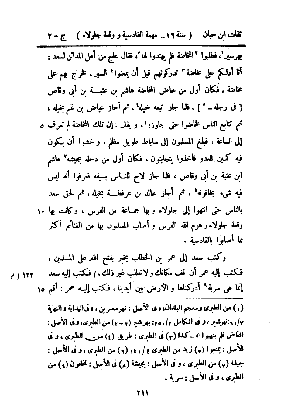 على بهرسير فطلبوا المخاضة فَلم يهتدوا لَهَا فَقَالَ علج من أهل الْمَدَائِن لسعد أَنا أدلكم على مخاضة تدركونهم قبل أَن يمنعوا السّير فَخرج بهم على مخاضة فَكَانَ أول من خَاضَ المخاضة هَاشم بْن عتبَة بْن أبي وَقاص فِي رجله فَلَمَّا جَازَ تبعه خيله ثمَّ أحاز عِيَاض بْن غنم بخيله ثمَّ تتَابع النَّاس فخاضوا حَتَّى جاوزوا وَيُقَال إِن تِلْكَ المخاضة لم تعرف إِلَى السَّاعَة فَبلغ الْمُسلمُونَ إِلَى ساباط طَوِيل مظلم وخشوا أَن يكون فِيهِ كمين لِلْعَدو فَأخذُوا يتجابنون فَكَانَ أول من دخله بجيشه هَاشم بْن عتبَة بْن أبي وَقاص فَلَمَّا جَازَ لَاحَ للنَّاس بِسَيْفِهِ فعرفوا أَنه لَيْسَ فِيهِ شَيْء يخافونه ثمَّ أجَاز خَالِد بْن عرفطة بخيله ثمَّ لحق سعد بِالنَّاسِ حَتَّى انْتَهوا إِلَى جَلُولَاء وَبهَا جمَاعَة من الْفرس وَكَانَت بهَا وقْعَة جَلُولَاء وَهزمَ اللَّه الْفرس وَأصَاب الْمُسلمُونَ بهَا من الْغَنَائِم أَكثر مِمَّا أَصَابُوا بالقادسية وَكتب سعد إِلَى عمر بْن الْخطاب يخبر بِفَتْح اللَّه على الْمُسلمين فَكتب إِلَيْهِ عمر أَن قف مَكَانك وَلَا تطلب غير ذَلِك فَكتب إِلَيْهِ سعد إِنَّمَا هِيَ سربة أدركناها وَالْأَرْض بَين أَيْدِينَا فَكتب إِلَيْهِ عمر أقِم