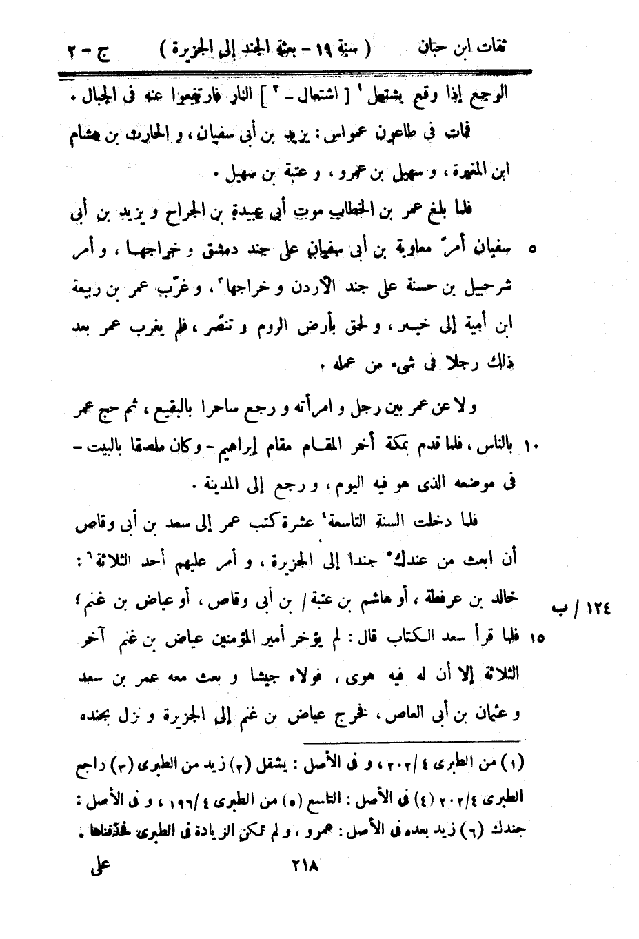 الوجع رَحْمَة ربكُم ودعوة نَبِيكُم وَمَوْت الصَّالِحين قبلكُمْ إِن معَاذًا يسْأَل اللَّه أَن يقسم لَهُ حَظه ثمَّ لأهل بَيته فطعن ابْنه عَبْد الرَّحْمَن بْن معَاذ فَمَاتَ ثمَّ طعن معَاذ فِي رَاحَته فَكَانَ يقبل ظهر كَفه وَكَانَ يَقُول مَا أحب أَن لي بِمَا فِيك من الدُّنْيَا شَيْئا ثمَّ مَاتَ واستخلف على النَّاس عَمْرو بْن الْعَاصِ فَقَامَ فيهم خَطِيبًا فَقَالَ أَيهَا النَّاس إِن هَذَا الوجع إِذا وَقع يشتعل اشتعال النَّار فَارْتَفعُوا عَنهُ فِي الْجبَال فَمَاتَ فِي طاعون عمواس يزِيد بْن أبي سُفْيَان والْحَارث بْن هِشَام بْن الْمُغيرَة وَسُهيْل بْن عَمْرو وَعتبَة بْن سُهَيْل فَلَمَّا بلغ عمر بْن الْخطاب موت أبي عُبَيْدَة بْن الْجراح وَيزِيد بْن أبي سُفْيَان أَمر مُعَاوِيَة بْن أبي سُفْيَان على جند دمشق وخراجها وَأمر شُرَحْبِيل بْن حَسَنَة على جند الْأُرْدُن وخراجها وَغرب عمر بْن ربيعَة بْن أُميَّة إِلَى خَيْبَر وَلحق بِأَرْض الرّوم وَتَنصر فَلم يغرب عمر بعد ذَلِك فِي رجلا شَيْء من عمله وَلَا عَن عمر بَين رجل وَامْرَأَته وَرجع ساحرا بِالبَقِيعِ ثمَّ حج عمر بِالنَّاسِ فَلَمَّا قدم بِمَكَّة أخر الْمقَام مقَام إِبْرَاهِيم وَكَانَ مُلْصقًا بِالْبَيْتِ فِي مَوْضِعه الَّذِي هُوَ فِيهِ الْيَوْم وَرجع إِلَى الْمَدِينَة فَلَمَّا دخلت السّنة التَّاسِعَة عشرَة كتب عمر إِلَى سعد بْن أبي وَقاص أَن ابْعَثْ من عنْدك جندا إِلَى الجزيرة وَأمر عَلَيْهِم أحد الثَّلَاثَة خَالِد بْن عرفطة أَو هَاشم بْن عتبَة بْن أبي وَقاص أَو عِيَاض بْن غنم فَلَمَّا قَرَأَ سعد الْكتاب قَالَ لم يُؤَخر أَمِير الْمُؤمنِينَ عِيَاض بْن غنم آخر الثَّلَاثَة إِلَّا أَن لَهُ فِيهِ هوى فولاه جَيْشًا وَبعث مَعَه عمر بْن سعد وَعُثْمَان بْن أبي الْعَاصِ فَخرج عِيَاض بْن غنم إِلَى الجزيرة وَنزل بجنده