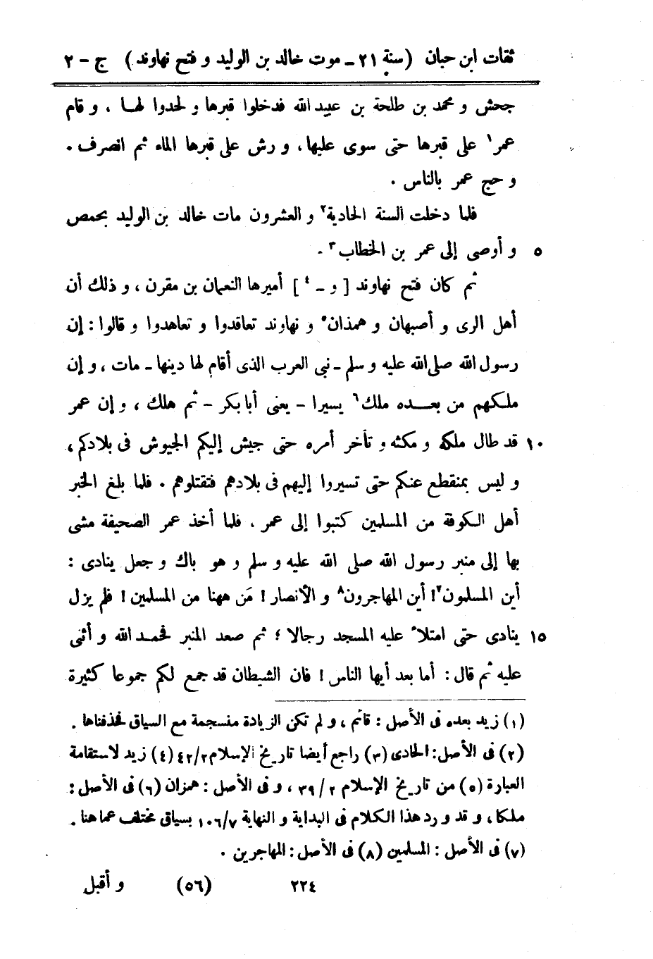 جحش وَمُحَمّد بْن طَلْحَة بْن عبيد اللَّه فَدَخَلُوا قبرها ولحدوا لَهَا وَقَامَ عمر على قبرها حَتَّى سوى عَلَيْهَا ورش على قبرها المَاء ثمَّ انْصَرف وَحج عمر بِالنَّاسِ فَلَمَّا دخلت السّنة الْحَادِيَة وَالْعشْرُونَ مَاتَ خَالِد بْن الْوَلِيد بحمص وَأوصى إِلَى عمر بْن الْخطاب ثمَّ كَانَ فتح نهاوند وأميرها النُّعْمَان بْن مقرن وَذَلِكَ أَن أهل الرّيّ وأصبهان وهمذان ونهاوند تعاقدوا وتعاهدوا وَقَالُوا أَن رَسُول اللَّهِ صَلَّى اللَّهُ عَلَيْهِ وَسَلَّمَ نَبِي الْعَرَب الَّذِي أَقَامَ لَهَا دينهَا مَاتَ وَإِن ملكهم من بعده ملك يَسِيرا يَعْنِي أَبَا بكر ثمَّ هلك وَإِن عمر قد طَال ملكه ومكثه وَتَأَخر أمره حَتَّى جَيش إِلَيْكُم الجيوش فِي بِلَادكُمْ وَلَيْسَ بمنقطع عَنْكُم حجتي تسيروا إِلَيْهِم فِي بِلَادهمْ فتقتلوهم فَلَمَّا بلغ الْخَبَر أهل الْكُوفَة من الْمُسلمين كتبُوا إِلَى عمر فَلَمَّا أَخذ عمر الصَّحِيفَة مَشى بهَا إِلَى مِنْبَر رَسُول اللَّهِ صَلَّى اللَّهُ عَلَيْهِ وَسَلَّمَ وَهُوَ باك وَجعل يُنَادي أَيْن الْمُسلمُونَ أَيْن الْمُهَاجِرُونَ وَالْأَنْصَار من هَهُنَا من الْمُسلمين فَلم يزل يُنَادي حَتَّى امْتَلَأَ عَلَيْهِ الْمَسْجِد رجالاثم صعد الْمِنْبَر فَحَمدَ اللَّه وَأثْنى عَلَيْهِ ثمَّ قَالَ أما بعد أَيهَا النَّاس فَإِن الشَّيْطَان قد جمع لكم جموعا كَثِيرَة