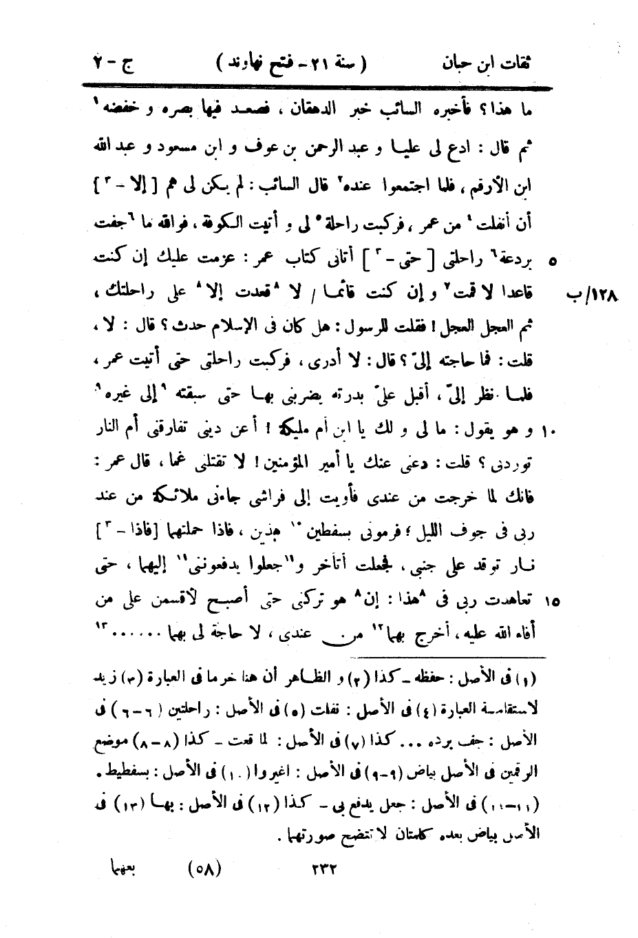 مَا هَذَا فَأخْبرهُ السَّائِب خبر الدهْقَان فَصَعدَ فِيهَا بَصَره وخفضه ثمَّ قَالَ ادْع لي عليا وَعبد الرَّحْمَن بْن عَوْف وَابْن مَسْعُود وَعبد اللَّه بْن الأرقم فَلَمَّا اجْتَمعُوا عِنْده قَالَ السَّائِب لم يكن لي هم إِلَّا أَن أنفلت من عمر فركبت رَاحِلَة لي وأتيت الْكُوفَة فوَاللَّه مَا جَفتْ بردعة رَاحِلَتي حَتَّى أَتَانِي كتاب عمر عزمت عَلَيْك إِن كنت قَاعِدا لَا قُمْت وَإِن كنت قَائِما لَا قعدت إِلَّا على راحلتك ثمَّ الْعجل الْعجل فَقلت للرسول هَل كَانَ فِي الْإِسْلَام حدث قَالَ لَا قلت فَمَا حَاجته إِلَى قَالَ لَا أَدْرِي فركبت رَاحِلَتي حَتَّى أتيت عمر فَلَمَّا نظر إِلَى أقبل على بدرته يضربني بهَا حَتَّى سبقته إِلَى غَيره وَهُوَ يَقُول مَا لي وَلَك يَا بن أم مليكَة أعن ديني تُفَارِقنِي أم النَّار توردني قلت دَعْنِي عَنْك يَا أَمِير الْمُؤمنِينَ لَا تقتلني غما قَالَ عمر فَإنَّك لما خرجت من عِنْدِي فأويت إِلَى فِرَاشِي جَاءَنِي مَلَائِكَة من عِنْد رَبِّي فِي جَوف اللَّيْل فرموني بسفطين هذَيْن فَإِذا حملتهما فَإِذا نَار توقد على جَنْبي فَجعلت أتأخر وَجعلُوا يدفعونني إِلَيْهِمَا حَتَّى تعاهدت رَبِّي فِي هَذَا إِن هُوَ تركني حَتَّى أصبح لأقسمن على من أَفَاء اللَّه عَلَيْهِ أخرج بهما من عِنْدِي لَا حَاجَة لي بهما بهما