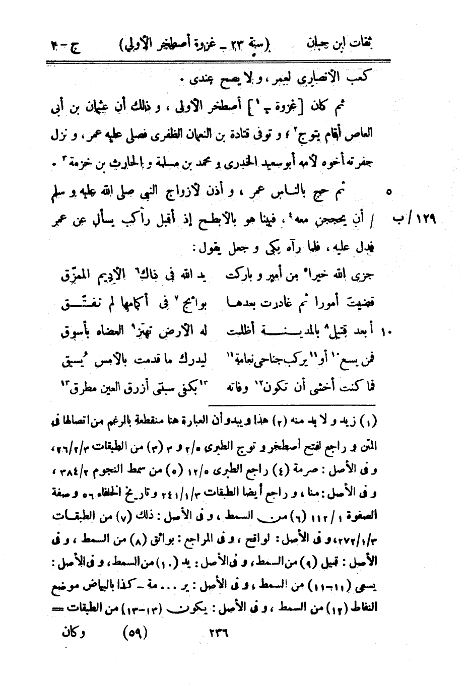 كَعْب الْأنْصَارِيّ لعمر وَلَا يَصح عِنْدِي ثمَّ كَانَ غَزْوَة أصطخر الأولى وَذَلِكَ أَن عُثْمَان بْن أبي الْعَاصِ أَقَامَ يتوج وَتُوفِّي قَتَادَة بْن النُّعْمَان الظفري فصلى عَلَيْهِ عمر وَنزل حفرته أَخُوهُ لأمه أَبُو سعيد الْخُدْرِيّ وَمُحَمّد بْن مسلمة والْحَارث بْن خزمة ثمَّ حج بِالنَّاسِ عمر وَأذن لِأَزْوَاج النَّبِي صَلَّى اللَّهُ عَلَيْهِ وَسَلَّمَ أَن يحججن مَعَه فَبينا هُوَ بِالْأَبْطح إِذْ أقبل رَاكب يسْأَل عَن عمر فَدلَّ عَلَيْهِ فَلَمَّا رَآهُ بَكَى وَجعل يَقُول ... جزى اللَّه خيرا من أَمِير وباركت ... يَد اللَّه فِي ذَاك الْأَدِيم الممزق ... ... قضيت أمورا ثمَّ غادرت بعْدهَا ... بوائج فِي أكمامها لم تفتق ... ... أبعد قَتِيل بِالْمَدِينَةِ أظلمت ... لَهُ الأَرْض تهتز العضاه بأسوق ... ... فَمن يسع أَو يركب جناحي نعَامَة ... ليدرك مَا قدمت بالْأَمْس يسْبق ... ... فَمَا كنت أخْشَى أَن تكون وَفَاته ... بكفي سبنتي أَزْرَق الْعين مطرق ...