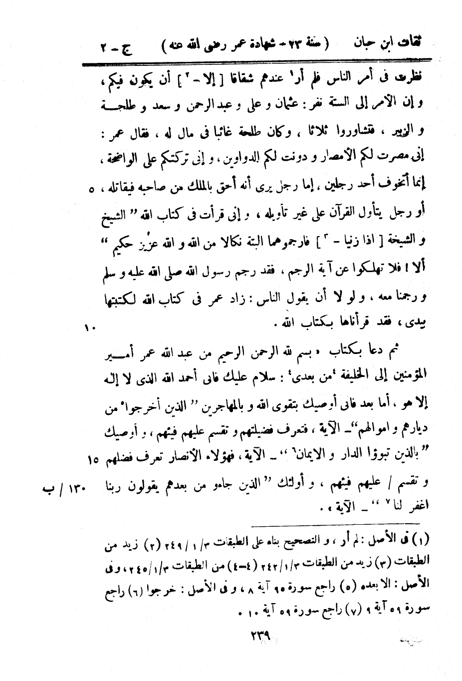 نظرت فِي أَمر النَّاس فَلم أر عِنْدهم شقاقا إِلَّا أَن يكون فِيكُم وَإِن الْأَمر إِلَى السِّتَّة نفر عُثْمَان وعَلى وَعبد الرَّحْمَن وَسعد وَطَلْحَة وَالزُّبَيْر فتشاوروا ثَلَاثًا وَكَانَ طَلْحَة غَائِبا فِي مَال لَهُ فَقَالَ عمر إِنِّي مصرت لكم الْأَمْصَار ودونت لكم الدَّوَاوِين وَإِنِّي تركتكم على الْوَاضِحَة إِنَّمَا أَتَخَوَّف أحد رجلَيْنِ إِمَّا رجل يرى أَنه أَحَق بِالْملكِ من صَاحبه فيقاتله أَو رجل يتَأَوَّل الْقُرْآن فِي كتاب اللَّه الشَّيْخ وَالشَّيْخَة غذا زَنَيَا فَارْجُمُوهُمَا الْبَتَّةَ نكالا من اللَّه وَالله عَزِيز حَكِيم أَلا فَلَا تهلكوا عَن آيَة الرَّجْم فقد رجم رَسُول اللَّهِ صَلَّى اللَّهُ عَلَيْهِ وَسَلَّمَ ورجمنا مَعَه وَلَوْلَا أَن يَقُول النَّاس زَاد عمر فِي كتاب اللَّه لكتبتها بيَدي فقد قرأناها بِكِتَاب اللَّه ثمَّ دَعَا بِكِتَاب بِسم اللَّه الرَّحْمَن الرَّحِيم من عَبْد اللَّه عمر أَمِير الْمُؤمنِينَ إِلَى الْخَلِيفَة من بعدِي سَلام عَلَيْك فَإِنِّي أَحْمد الله الذلا لَا إِلَه إِلَّا هُوَ أما بعد فَإِنِّي أوصيك بتقوى اللَّه وبالمهاجرين الَّذِينَ أُخْرِجُوا مِنْ دِيَارِهِمْ وَأَمْوَالهمْ الْآيَة فتعرف فضيلتهم وتقسم عَلَيْهِم فيئهم وأوصيك بالذين تبوؤا الدَّار والايمان الْآيَة فَهَؤُلَاءِ الْأَنْصَار تعرف فَضلهمْ وتقسم عَلَيْهِم فيئهم وَأُولَئِكَ الَّذِينَ جاءو مِنْ بَعْدِهِمْ يَقُولُونَ رَبَّنَا اغْفِرْ لنا الْآيَة