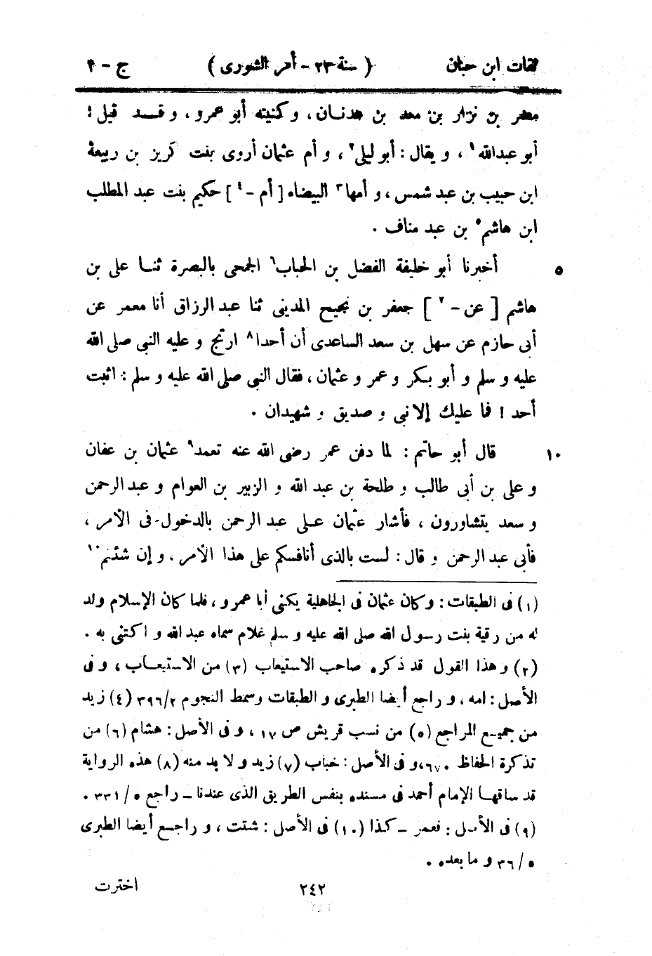 مُضر بْن نزار بْن معد بْن عدنان وكنيته أَبُو عَمْرو وَقد قيل أَبُو عَبْد اللَّه وَيُقَال أَبُو ليلى وَأم عُثْمَان أروى بنت كريز بْن ربيعَة بْن حبيب بْن عَبْد شمس وَأمّهَا الْبَيْضَاء أم حَكِيم بنت عَبْد الْمطلب بْن هِشَام بْن عَبْد منَاف أَخْبَرَنَا أَبُو خَلِيفَةَ الْفَضْلُ بْنُ الْحُبَابِ الْجُمَحِيُّ بِالْبَصْرَةِ ثَنَا عَلِيُّ بْنُ هَاشِمٍ عَنْ جَعْفَرِ بْنِ نَجِيحٍ الْمَدِينِيِّ ثَنَا عَبْدُ الرَّزَّاقِ أَنا مَعْمَرٌ عَنِ أَبِي حَازِمٍ عَنْ سَهْلِ بْنِ سَعْدٍ السَّاعِدِيِّ أَنَّ أُحُدًا ارْتَجَّ وَعَلَيْهِ النَّبِيُّ صَلَّى اللَّهُ عَلَيْهِ وَسَلَّمَ وَأَبُو بَكْرٍ وَعُمَرُ وَعُثْمَانُ فَقَالَ النَّبِي صَلَّى اللَّهُ عَلَيْهِ وَسَلَّمَ اثْبُتْ أُحُدُ فَمَا عَلَيْكَ إِلا نَبِيٌّ وَصِدِّيقٌ وَشَهِيدَانِ قَالَ أَبُو حَاتِم لما دفن عمر رَضِي الله عَنهُ تعمد عُثْمَان بْن عَفَّان وَعلي بْن أبي طَالب وَطَلْحَة بْن عَبْد اللَّه وَالزُّبَيْر بْن الْعَوام وَعبد الرَّحْمَن وَسعد يتشاورون فَأَشَارَ عُثْمَان على عَبْد الرَّحْمَن بِالدُّخُولِ فِي الْأَمر فَأبى عَبْد الرَّحْمَن وَقَالَ لست بِالَّذِي أنافسكم على هَذَا الْأَمر وَإِن شِئْتُم