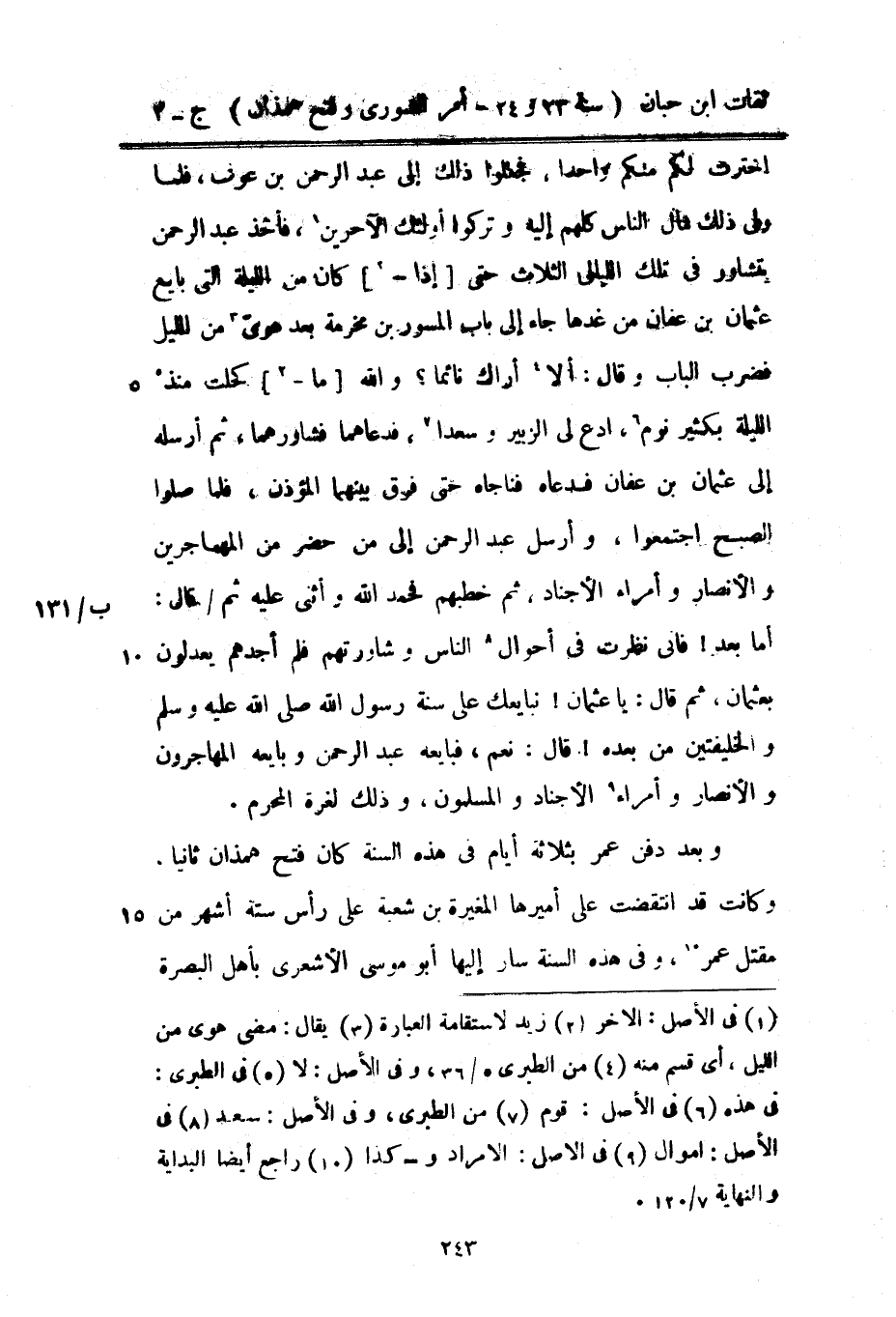 اخْتَرْت لكم مِنْكُم وَاحِدًا فَجعلُوا ذَلِك إِلَى عَبْد الرَّحْمَن بْن عَوْف فَلَمَّا ولى ذَلِك مَال النَّاس كلهم إِلَيْهِ وَتركُوا أُولَئِكَ الآخرين فَأخذ عَبْد الرَّحْمَن يتشاور فِي تِلْكَ اللَّيَالِي الثَّلَاث حَتَّى إِذا كَانَ من اللَّيْلَة الَّتِي بَايع عُثْمَان بْن عَفَّان من غدها جَاءَ إِلَى بَاب الْمسور بْن مخرمَة بعد هوى من اللَّيْل فَضرب الْبَاب وَقَالَ أَلا أَرَاك نَائِما وَالله مَا كحلت مُنْذُ اللَّيْلَة بِكَثِير نوم ادْع لي الزبير وسعدا فدعاهما فشاورهما ثمَّ أرْسلهُ إِلَى عُثْمَان بْن عَفَّان فَدَعَاهُ فناجاه حَتَّى فرقف بَينهمَا الْمُؤَذّن فَلَمَّا صلوا الصُّبْح اجْتَمعُوا وَأرْسل عَبْد الرَّحْمَن إِلَى من حضر من الْمُهَاجِرين وَالْأَنْصَار وأمراء الأجناد ثمَّ خطبهم فَحَمدَ اللَّه وَأثْنى عَلَيْهِ ثمَّ قَالَ أما بعد فَإِنِّي نظرت فِي أَحْوَال النَّاس وشاورتهم فَلم أجدهم يعدلُونَ بعثمان ثمَّ قَالَ يَا عُثْمَان نُبَايِعك على سنة رَسُول اللَّهِ صَلَّى اللَّهُ عَلَيْهِ وَسَلَّمَ والخليفتين من بعده قَالَ نعم فَبَايعهُ عَبْد الرَّحْمَن وَبَايَعَهُ الْمُهَاجِرُونَ وَالْأَنْصَار وأمراء الأجناد والمسلمون وَذَلِكَ لغرة الْمحرم وَبعد دفن عمر بِثَلَاثَة أَيَّام فِي هَذِه السّنة كَانَ فتح همذان ثَانِيًا وَكَانَت قد انتقضت على أميرها الْمُغيرَة بْن شُعْبَة على رَأس سِتَّة أشهر من مقتل عمر وَفِي هَذِه السّنة سَار إِلَيْهَا أَبُو مُوسَى الْأَشْعَرِيّ بِأَهْل الْبَصْرَة