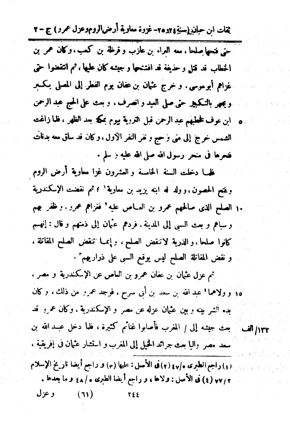 حَتَّى فتحهَا صلحا مَعَه الْبَراء بْن عَازِب وقرظة بْن كَعْب وَكَانَ عمر بْن الْخطاب قد قتل وَحُذَيْفَة قد افتتحها وجيشه كَانَ عَلَيْهَا ثمَّ انتقضوا حَتَّى غزاهم أَبُو مُوسَى وَخرج عُثْمَان بْن عَفَّان يَوْم الْفطر إِلَى الْمصلى يكبر ويجهر بِالتَّكْبِيرِ حَتَّى صلى الْعِيد وَانْصَرف وَبعث على الْحَج عَبْد الرَّحْمَن بْن عَوْف فخطبهم عَبْد الرَّحْمَن قبل التَّرويَة بِيَوْم مَكَّة بعد الظّهْر فَلَمَّا زاغت الشَّمْس خرج إِلَى منى وَحج وَنَفر النَّفر الأول وَكَانَ قد سَاق مَعَه بدنات فنحرها فِي منحر رَسُول اللَّهِ صَلَّى اللَّهُ عَلَيْهِ وَسَلَّمَ فَلَمَّا دخلت السّنة الْخَامِسَة وَالْعشْرُونَ غزا مُعَاوِيَة أَرض الرّوم وَفتح الْحُصُون وَولد لَهُ ابْنه يزِيد بْن مُعَاوِيَة ثمَّ نقضت الْإسْكَنْدَريَّة الصُّلْح الَّذِي صَالحهمْ عَمْرو بْن الْعَاصِ عَلَيْهِ فغزاهم عَمْرو وظفر بهم وسباهم وَبعث السَّبي إِلَى الْمَدِينَة فردهم عُثْمَان إِلَى ذمتهم وَقَالَ إِنَّهُم كَانُوا صلحا والذرية لَا تنقض الصُّلْح وَإِنَّمَا تنقض الصُّلْح الْمُقَاتلَة وَنقض الْمُقَاتلَة الصُّلْح لَيْسَ يُوقع السَّبي على ذَرَارِيهمْ ثمَّ عزل عُثْمَان بْن عَفَّان عَمْرو بْن الْعَاصِ عَن الْإسْكَنْدَريَّة ومصر وولاهما عَبْد اللَّه بْن سعد بْن أبي سرح فَوجدَ عَمْرو من ذَلِك وَكَانَ بَدْء الشَّرّ بَينه وَبَين عُثْمَان عَزله عَن مصر والإسكندرية وَكَانَ عَمْرو قد بعث جَيْشه إِلَى الْمغرب فَأَصَابُوا غَنَائِم كَثِيرَة فَلَمَّا دخل عَبْد اللَّه بْن سعد مصر واليا بعث جرائد الْخَيل إِلَى الْمغرب وَاسْتَشَارَ عُثْمَان فِي إفريقية