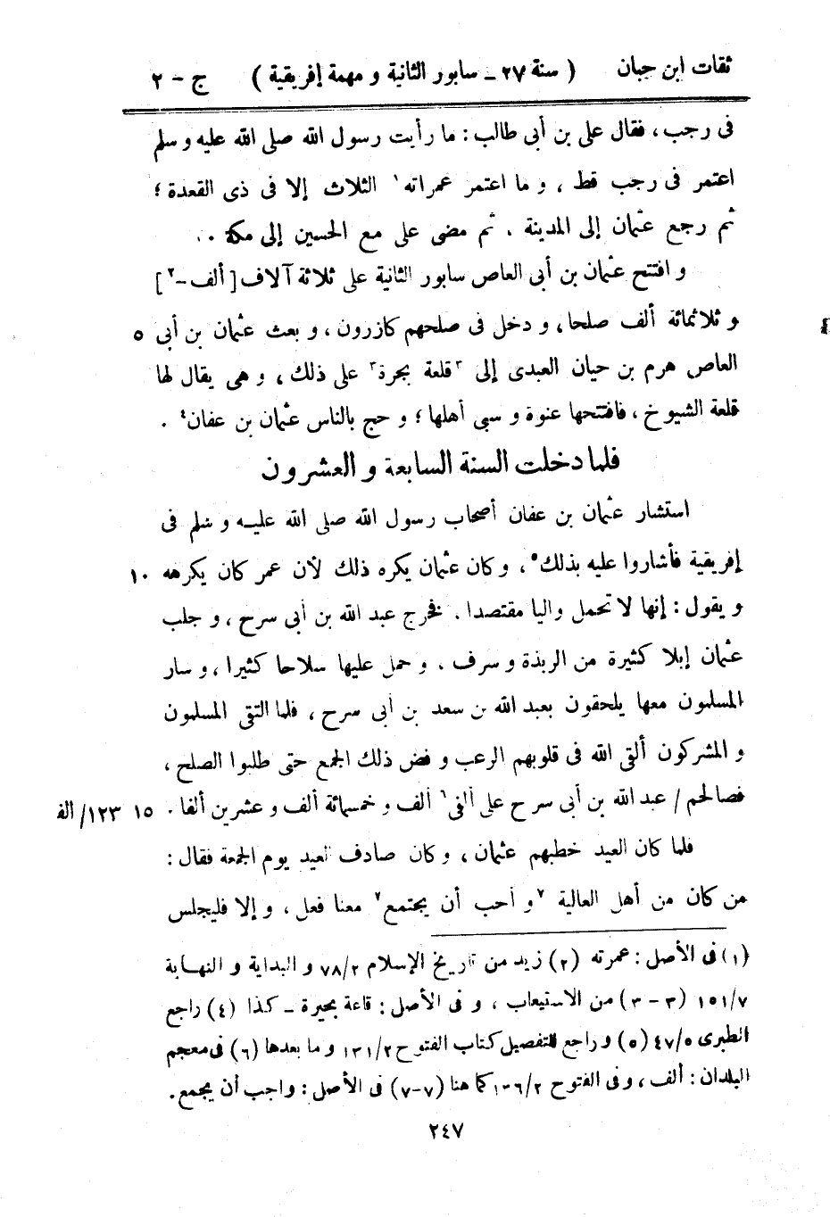 فِي رَجَب فَقَالَ عَليّ بْن أبي طَالب مَا رَأَيْت رَسُول اللَّهِ صَلَّى اللَّهُ عَلَيْهِ وَسَلَّمَ اعْتَمر فِي رَجَب قطّ وَمَا اعْتَمر عمراته الثَّلَاث إِلَّا فِي ذِي الْقعدَة ثمَّ رَجَعَ عُثْمَان إِلَى الْمَدِينَة ثمَّ مضى عَليّ مَعَ الْحُسَيْن إِلَى مَكَّة وافتتح عُثْمَان بْن أبي الْعَاصِ سَابُور الثَّانِيَة على ثَلَاثَة آلَاف ألف وثلاثمائة ألف صلحا وَدخل فِي صلحهم كازرون وَبعث عُثْمَان بْن أبي الْعَاصِ هرم بْن حَيَّان الْعَبْدي إِلَى قلعة بجرة على ذَلِك وَهِي يُقَال لَهَا قلعة الشُّيُوخ فافتتحها عنْوَة وسبى أَهلهَا وَحج بِالنَّاسِ عُثْمَان بْن عَفَّان فَلَمَّا دخلت السّنة السَّابِعَة وَالْعشْرُونَ اسْتَشَارَ عُثْمَان بْن عَفَّان أَصْحَاب رَسُول اللَّهِ صَلَّى اللَّهُ عَلَيْهِ وَسَلَّمَ فِي إفريقية فأشاروا عَلَيْهِ بذلك وَكَانَ عُثْمَان يكره ذَلِك لِأَن عمر كَانَ يكرههُ وَيَقُول إِنَّهَا لَا تحمل واليًا مقتصدًا فَخرج عَبْد اللَّه بْن أبي سرح وجلب عُثْمَان إبِلا كَثِيرَة من الربذَة وسرف وَحمل عَلَيْهَا سِلَاحا كثيرا وَسَار الْمُسلمُونَ مَعهَا يلحقون بِعَبْد اللَّه بْن سعد بْن أبي سرح فَلَمَّا التقى الْمُسلمُونَ وَالْمُشْرِكُونَ ألقِي اللَّه فِي قُلُوبهم الرعب وفض ذَلِك الْجمع حَتَّى طلبُوا الصُّلْح فَصَالحهُمْ عَبْد اللَّه بْن أبي سرح على ألفي ألف وَخَمْسمِائة ألف وَعشْرين ألفا فَلَمَّا كَانَ الْعِيد خطبهم عُثْمَان وَكَانَ صَادف الْعِيد يَوْم الْجُمُعَة فَقَالَ من كَانَ من أهل الْعَالِيَة وَأحب أَن يجْتَمع مَعنا فعل وَإِلَّا فليجلس