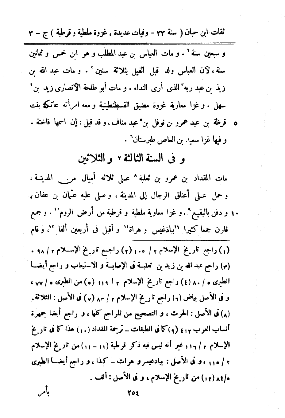 وَسبعين سنة وَمَات الْعَبَّاس بْن عبد الْمطلب وَهُوَ بن خمس وَثَمَانِينَ سنة لِأَن الْعَبَّاس ولد قبل الْفِيل بِثَلَاثَة سِنِين وَمَات عَبْد اللَّه بْن زيد بْن عَبْد ربه الَّذِي أرى النداء وَمَات أَبُو طَلْحَة الْأنْصَارِيّ زيد بْن سهل وغزا مُعَاوِيَة غَزْوَة مضيق الْقُسْطَنْطِينِيَّة وَمَعَهُ امْرَأَته عَاتِكَة بنت قرظة بْن عَبْد عَمْرو بْن نَوْفَل بْن عَبْد منَاف وَقد قيل إِن اسْمهَا فَاخِتَة وفيهَا غزا سعيد بْن الْعَاصِ طبرستان وَفِي السّنة الثَّالِثَة وَالثَّلَاثِينَ مَاتَ الْمِقْدَاد بْن عَمْرو بْن ثَعْلَبَة على ثَلَاثَة أَمْيَال من الْمَدِينَة وَحمل على أَعْنَاق الرِّجَال إِلَى الْمَدِينَة وَصلى عَلَيْهِ عُثْمَان بْن عَفَّان وَدفن بِالبَقِيعِ وغزا مُعَاوِيَة ملطية وقرطبة من أَرض الرّوم وَجمع قَارن جمعا كثيرا بباذغيس وهراة وَأَقْبل فِي أَرْبَعِينَ ألفا وَقَامَ