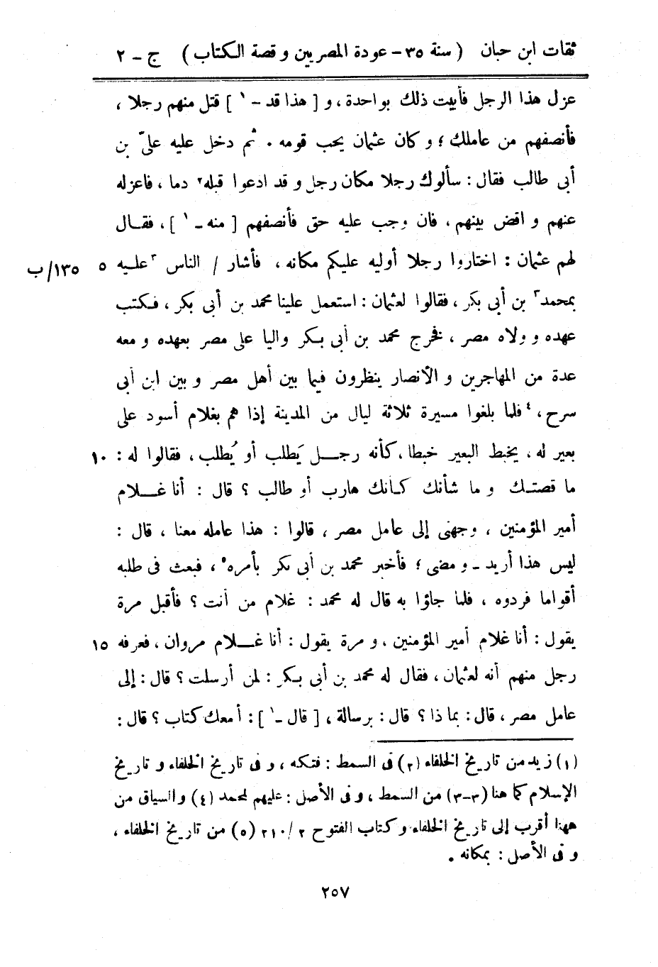عزل هَذَا الرجل فأبيت ذَلِك بِوَاحِدَة وَهَذَا قد قتل مِنْهُم رجلا فأنصفهم من عاملك وَكَانَ عُثْمَان يحب قومه ثمَّ دخل عَلَيْهِ عَليّ بْن أبي طَالب فَقَالَ سألوك رجلا مَكَان رجل وَقد ادعوا قبله دَمًا فاعزله عَنْهُم واقض بَينهم فَإِن وَجب عَلَيْهِ حق فأنصفهم مِنْهُ فَقَالَ لَهُم عُثْمَان اخْتَارُوا رجلا أوليه عَلَيْكُم مَكَانَهُ فَأَشَارَ النَّاس عَلَيْهِ بِمُحَمد بْن أبي بكر فَقَالُوا لعُثْمَان اسْتعْمل علينا مُحَمَّد بْن أبي بكر فَكتب عَهده وولاه مصر فَخرج مُحَمَّد بْن أبي بكر واليا على مصر بعهده وَمَعَهُ عدَّة من الْمُهَاجِرين وَالْأَنْصَار ينظرُونَ فِيمَا بَين أهل مصر وَبَين بْن أبي سرح فَلَمَّا بلغُوا مسيرَة ثَلَاثَة لَيَال من الْمَدِينَة إِذا هم بِغُلَام أسود على بعير لَهُ يخبط الْبَعِير خبطا كَأَنَّهُ رجل يطْلب أَو يطْلب فَقَالُوا لَهُ مَا قصتك وَمَا شَأْنك كَأَنَّك هارب أَو طَالب قَالَ أَنا غُلَام أَمِير الْمُؤمنِينَ وجهني إِلَى عَامل مصر قَالُوا هَذَا عَامله مَعنا قَالَ لَيْسَ هَذَا أُرِيد وَمضى فَأخْبر مُحَمَّد بْن أبي بكر بأَمْره فَبعث فِي طلبه أَقْوَامًا فَردُّوهُ فَلَمَّا جاؤوا بِهِ قَالَ لَهُ مُحَمَّد غُلَام من أَنْت فَأقبل مرّة يَقُول أَنا غُلَام أَمِير الْمُؤمنِينَ وَمرَّة يَقُول أَنا غُلَام مَرْوَان فَعرفهُ رجل مِنْهُم أَنه لعُثْمَان فَقَالَ لَهُ مُحَمَّد بْن أبي بكر لمن أرْسلت قَالَ إِلَى عَامل مصر قَالَ بِمَاذَا قَالَ برسالة قَالَ أَمَعَك كتاب قَالَ