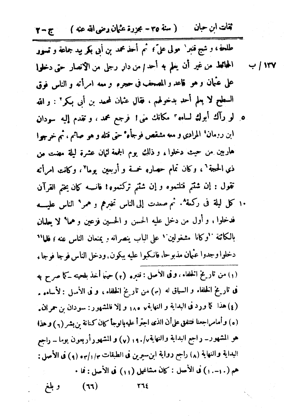 طَلْحَة وشج قنبر مولى على ثمَّ أَخذ مُحَمَّد بْن أبي بكر بيد جمَاعَة وتسور الْحَائِط من غير أَن يعلم بِهِ أحد من دَار رجل من الْأَنْصَار حَتَّى دخلُوا على عُثْمَان وَهُوَ قَاعد والمصحف فِي حجره وَمَعَهُ امْرَأَته وَالنَّاس فَوق السَّطْح لَا يعلم أحد بدخولهم فَقَالَ عُثْمَان لمُحَمد بْن أبي بكر وَالله لَو رآك أَبوك لساءه مَكَانك مني فَرجع مُحَمَّد وَتقدم إِلَيْهِ سودان بْن رُومَان الْمرَادِي وَمَعَهُ مشقص فوجأه حَتَّى قَتله وَهُوَ صَائِم ثمَّ خَرجُوا هاربين من حَيْثُ دخلُوا وَذَلِكَ يَوْم الْجُمُعَة لثمان عشرَة لَيْلَة مَضَت من ذِي الْحجَّة وَكَانَ تَمام حصاره خَمْسَة وَأَرْبَعين يَوْمًا وَكَانَت امْرَأَته تَقول إِن شِئْتُم قَتَلْتُمُوهُ وَإِن شِئْتُم تَرَكْتُمُوهُ فَإِنَّهُ كَانَ يخْتم الْقُرْآن كل لَيْلَة فِي رَكْعَة ثمَّ صعدت إِلَى النَّاس تخبرهم وهمر النَّاس عَلَيْهِ فَدَخَلُوا وَأول من دخل عَلَيْهِ الْحسن وَالْحُسَيْن فزعين وهما لَا يعلمَانِ بالكائنة وَكَانَا مشغولين على الْبَاب ينصرَانِهِ ويمنعان النَّاس عَنهُ فَلَمَّا دخلُوا وجدوا عُثْمَان مذبوحا فانكبوا عَلَيْهِ يَبْكُونَ وَدخل النَّاس فوجا فوجا