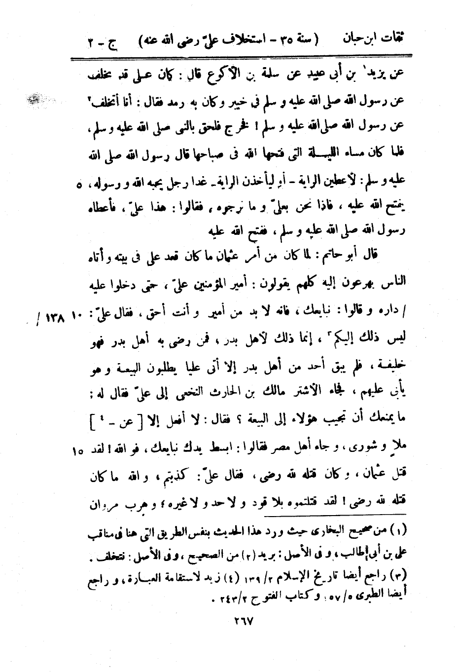 عَنْ يَزِيدَ بْنِ أَبِي عُبَيْدٍ عَنْ سَلَمَةَ بْنِ الأَكْوَعِ قَالَ كَانَ عَلِيٌّ قَدْ تَخَلَّفَ عَنْ رَسُولُ اللَّهِ صَلَّى اللَّهُ عَلَيْهِ وَسَلَّمَ فِي خَيْبَرَ وَكَانَ بِهِ رَمَدٌ فَقَالَ أَنَا أَتَخَلَّفُ عَنْ رَسُولُ اللَّهِ صَلَّى اللَّهُ عَلَيْهِ وَسَلَّمَ فَخَرَجَ فَلَحِقَ بِالنَّبِيِّ صَلَّى اللَّهُ عَلَيْهِ وَسَلَّمَ فَلَمَّا كَانَ مَسَاءُ اللَّيْلَةِ الَّتِي فَتَحَهَا اللَّهُ فِي صَبَاحِهَا قَالَ رَسُولُ اللَّهِ صَلَّى اللَّهُ عَلَيْهِ وَسَلَّمَ لَأُعْطيَن الرَّايَةَ أَوْ لَيَأْخُذَنَّ الرَّايَةَ غَدًا رَجُلٌ يُحِبُّهُ اللَّهُ وَرَسُولُهُ يَفْتَحُ اللَّهُ عَلَيْهِ فَإِذَا نَحْنُ بِعَلِيٍّ وَمَا نَرْجُوهُ فَقَالُوا هَذَا عَلِيٌّ فَأعْطَاهُ رَسُول اللَّهِ صَلَّى اللَّهُ عَلَيْهِ وَسَلَّمَ فَفَتَحَ اللَّهُ عَلَيْهِ قَالَ أَبُو حَاتِم لما كَانَ من أَمر من عُثْمَان مَا كَانَ قعد عَليّ فِي بَيته وَأَتَاهُ النَّاس يهرعون إِلَيْهِ كلهم يَقُولُونَ أَمِير الْمُؤمنِينَ عَليّ حَتَّى دخلُوا عَلَيْهِ دَاره وَقَالُوا نُبَايِعك فَإِنَّهُ لَا بُد من أَمِير وَأَنت أَحَق فَقَالَ عَليّ لَيْسَ ذَلِك إِلَيْكُم إِنَّمَا ذَلِك لأهل بدر فَمن رَضِي بِهِ أهل بدر فَهُوَ خَليفَة فَلم يبْق أحد من أهل بدر إِلَّا أَتَى عليا يطْلبُونَ الْبيعَة وَهُوَ يَأْبَى عَلَيْهِم فجَاء الأشتر مَالك بْن الْحَارِث النَّخعِيّ إِلَى عَليّ فَقَالَ لَهُ مَا يمنعك أَن تجيب هَؤُلَاءِ إِلَى الْبيعَة فَقَالَ لَا أفعل إِلَّا عَن ملإ وشورى وَجَاء أهل مصر فَقَالُوا ابْسُطْ يدك نُبَايِعك فوَاللَّه لقد قتل عُثْمَان وَكَانَ قَتله لله رضى فَقَالَ عَليّ كَذبْتُمْ وَالله مَا كَانَ قَتله لله رضى لقد قَتَلْتُمُوهُ بِلَا قَود وَلَا أحد وَلَا غَيره وهرب مَرْوَان