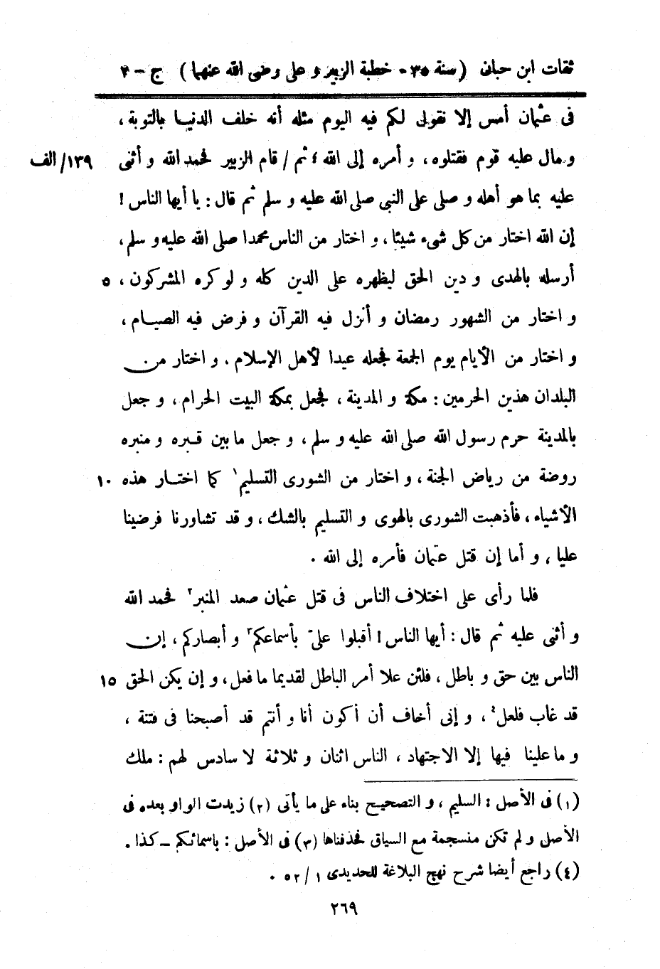 فِي عُثْمَان أمس إِلَّا نقُول لكم فِيهِ الْيَوْم مثله أَنه خلف الدُّنْيَا بِالتَّوْبَةِ وَمَال عَلَيْهِ قوم فَقَتَلُوهُ وَأمره إِلَى اللَّه ثمَّ قَامَ الزبير فَحَمدَ اتلله وَأَثْنَى عَلَيْهِ بِمَا هُوَ أَهْلُهُ وَصلى على النَّبِي صَلَّى اللَّهُ عَلَيْهِ وَسَلَّمَ ثمَّ قَالَ يَا أَيهَا النَّاس إِن اللَّه اخْتَار من كل شَيْء شَيْئا وَاخْتَارَ من النَّاس مُحَمَّدًا صَلَّى اللَّهُ عَلَيْهِ وَسَلَّمَ أرْسلهُ بِالْهدى وَدين الْحق لِيظْهرهُ على الدَّين كُله وَلَو كره الْمُشْركُونَ وَاخْتَارَ من الشُّهُور رَمَضَان وَأنزل فِيهِ الْقُرْآن وَفرض فِيهِ الصّيام وَاخْتَارَ من الْأَيَّام يَوْم الْجُمُعَة فَجعله عيدا لأهل الْإِسْلَام وَاخْتَارَ من الْبلدَانِ هذَيْن الْحَرَمَيْنِ مَكَّة وَالْمَدينَة فَجعل بِمَكَّة الْبَيْت الْحَرَام وَجعل بِالْمَدِينَةِ حرم رَسُولُ اللَّهِ صَلَّى اللَّهُ عَلَيْهِ وَسَلَّمَ وَجعل مَا بَين قَبره ومنبره رَوْضَة من رياض الْجنَّة وَاخْتَارَ من الشورى التَّسْلِيم كَمَا اخْتَار هَذِه الْأَشْيَاء فأذهبت الشورى بالهوى وَالتَّسْلِيم بِالشَّكِّ وَقد تشاورنا فرضينا عليا وَأما إِن قتل عُثْمَان فَأمره إِلَى اللَّه فَلَمَّا رأى عَليّ اخْتِلَاف النَّاس فِي قتل عُثْمَان صعد الْمِنْبَر فَحَمدَ اللَّه وَأثْنى عَلَيْهِ ثمَّ قَالَ أَيهَا النَّاس أَقبلُوا عَليّ بأسماعكم وأبصاركم إِن النَّاس بَين حق وباطل فلئن عي أَمر الْبَاطِل لقديما مَا فعل وَإِن يكن الْحق قد غَابَ فَلَعَلَّ وَإِنِّي أَخَاف أَن أكون أَنا وَأَنْتُم قد أَصْبَحْنَا فِي فتْنَة وَمَا علينا فِيهَا إِلَّا الِاجْتِهَاد النَّاس اثْنَان وَثَلَاثَة لَا سادس لَهُم ملك