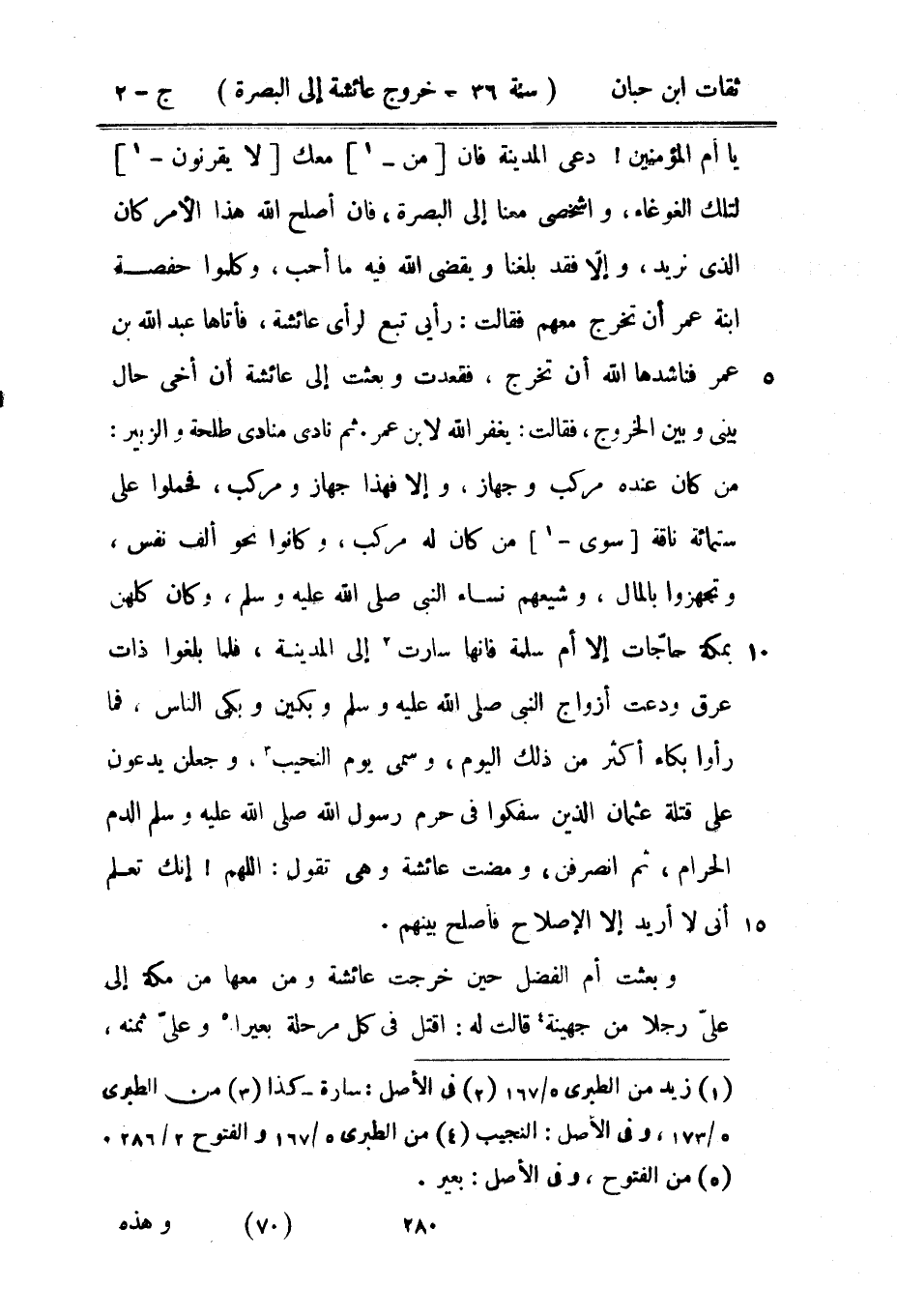 يَا أم الْمُؤمنِينَ دعِي الْمَدِينَة فَإِن من مَعَك لَا يقرنون لتِلْك الغوغاء واشخصي مَعنا إِلَى الْبَصْرَة فَإِن أصلح اللَّه هَذَا الْأَمر كَانَ الَّذِي نُرِيد وَإِلَّا فقد بلغنَا وَيقْضى اللَّه فِيهِ مَا أحب وكلموا حَفْصَة ابْنة عمر أَن تخرج مَعَهم فَقَالَت رَأْيِي تبع لرَأى عَائِشَة فَأَتَاهَا عَبْد اللَّه بْن عمر فناشدها اللَّه أَن تخرج فَقَعَدت وَبعث إِلَى عَائِشَة أَن أخي حَال بيني وَبَين الْخُرُوج فَقَالَت يغْفر اللَّه لِابْنِ عمر ثمَّ نَادَى منادى طَلْحَة وَالزُّبَيْر من كَانَ عِنْده مركب وجهاز وَإِلَّا فَهَذَا جهاز ومركب فحملوا على سِتّمائَة نَاقَة سوى من كَانَ لَهُ مركب وَكَانُوا نَحْو ألف نفس وتجهزوا بِالْمَالِ وشيعهم نسَاء النَّبِي صَلَّى اللَّهُ عَلَيْهِ وَسَلَّمَ وَكَانَ كُلهنَّ بِمَكَّة حاجات إِلَّا أم سَلمَة فَإِنَّهَا سَارَتْ إِلَى الْمَدِينَة فَلَمَّا بلغُوا ذَات عرق ودعت أَزْوَاجِ النَّبِيِّ صَلَّى اللَّهُ عَلَيْهِ وَسَلَّمَ وبكين وَبكى النَّاس فَمَا رَأَوْا بكاء أَكثر من ذَلِك الْيَوْم وسمى يَوْم النحيب وجعلن يدعونَ على قتلة عُثْمَان الَّذين سَفَكُوا فِي حرم رَسُول اللَّهِ صَلَّى اللَّهُ عَلَيْهِ وَسَلَّمَ الدَّم الْحَرَام ثمَّ انصرفن وَمَضَت عَائِشَة وَهِي تَقول اللَّهُمَّ إِنَّك تعلم أَنِّي لَا أُرِيد إِلَّا الْإِصْلَاح فَأصْلح بَينهم وَبعثت أم الْفضل حِين خرجت عَائِشَة وَمن مَعهَا من مَكَّة إِلَى عَليّ رجلا من جُهَيْنَة قَالَت اقْتُل فِي كل مرحلة بَعِيرًا وعَلى ثمنه