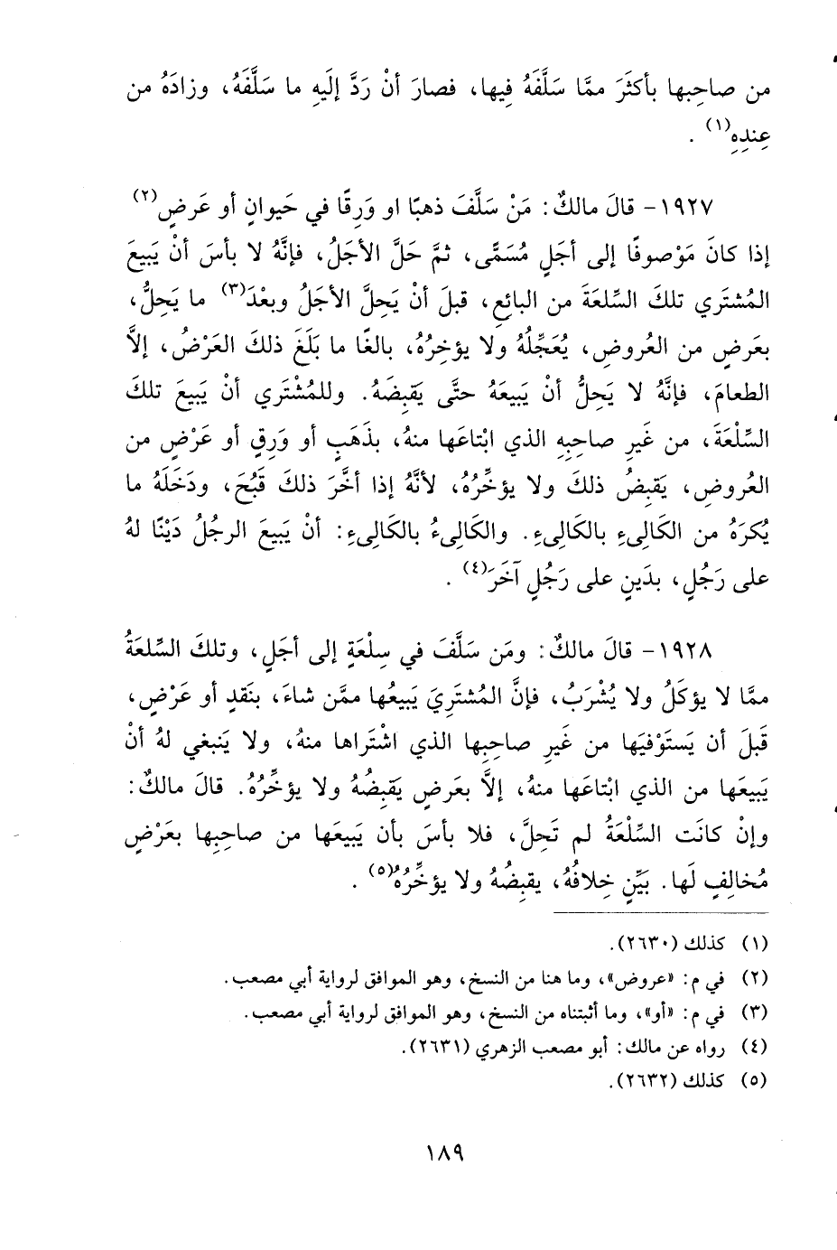 1928- قَالَ مَالِكٌ: وَمَنْ سَلَّفَ فِي سِلْعَةٍ إِلَى أَجَلٍ، وَتِلْكَ السِّلْعَةُ مِمَّا لاَ يُؤْكَلُ، وَلاَ يُشْرَبُ، فَإِنَّ الْمُشْتَرِيَ يَبِيعُهَا مِمَّنْ شَاءَ، بِنَقْدٍ أَوْ عَرْضٍ قَبْلَ أَنْ يَسْتَوْفِيَهَا مِنْ غَيْرِ صَاحِبِهَا الَّذِي اشْتَرَاهَا مِنْهُ، وَلاَ يَنْبَغِي لَهُ أَنْ يَبِيعَهَا مِنِ الَّذِي ابْتَاعَهَا مِنْهُ، إِلاَّ بِعَرْضٍ يَقْبِضُهُ وَلاَ يُؤَخِّرُهُ، قَالَ مَالِكٌ: وَإِنْ كَانَتِ السِّلْعَةُ لَمْ تَحِلَّ فَلاَ بَأْسَ بِأَنْ يَبِيعَهَا مِنْ صَاحِبِهَا بِعَرْضٍ مُخَالِفٍ لَهَا، بَيِّنٍ خِلاَفُهُ يَقْبِضُهُ وَلاَ يُؤَخِّرُهُ.