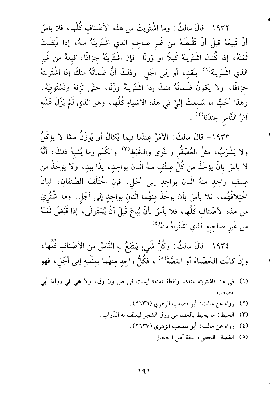 1933- قَالَ مَالِكٌ: الأَمْرُ عِنْدَنَا فِيمَا يُكَالُ أَوْ يُوزَنُ مِمَّا لاَ يُؤْكَلُ وَلاَ يُشْرَبُ مِثْلُ: الْعُصْفُرِ، وَالنَّوَى، وَالْخَبَطِ، وَالْكَتَمِ، وَمَا يُشْبِهُ ذَلِكَ، أَنَّهُ لاَ بَأْسَ بِأَنْ يُؤْخَذَ مِنْ كُلِّ صِنْفٍ مِنْهُ اثْنَانِ بِوَاحِدٍ يَدًا بِيَدٍ، وَلاَ يُؤْخَذُ مِنْ صِنْفٍ وَاحِدٍ مِنْهُ اثْنَانِ بِوَاحِدٍ إِلَى أَجَلٍ، فَإِنِ اخْتَلَفَ الصِّنْفَانِ فَبَانَ اخْتِلاَفُهُمَا، فَلاَ بَأْسَ بِأَنْ يُؤْخَذَ مِنْهُمَا اثْنَانِ بِوَاحِدٍ إِلَى أَجَلٍ، وَمَا اشْتُرِيَ مِنْ هَذِهِ الأَصْنَافِ كُلِّهَا، فَلاَ بَأْسَ بِأَنْ يُبَاعَ قَبْلَ أَنْ يُسْتَوْفَى، إِذَا قَبَضَ ثَمَنَهُ مِنْ غَيْرِ صَاحِبِهِ الَّذِي اشْتَرَاهُ مِنْهُ.