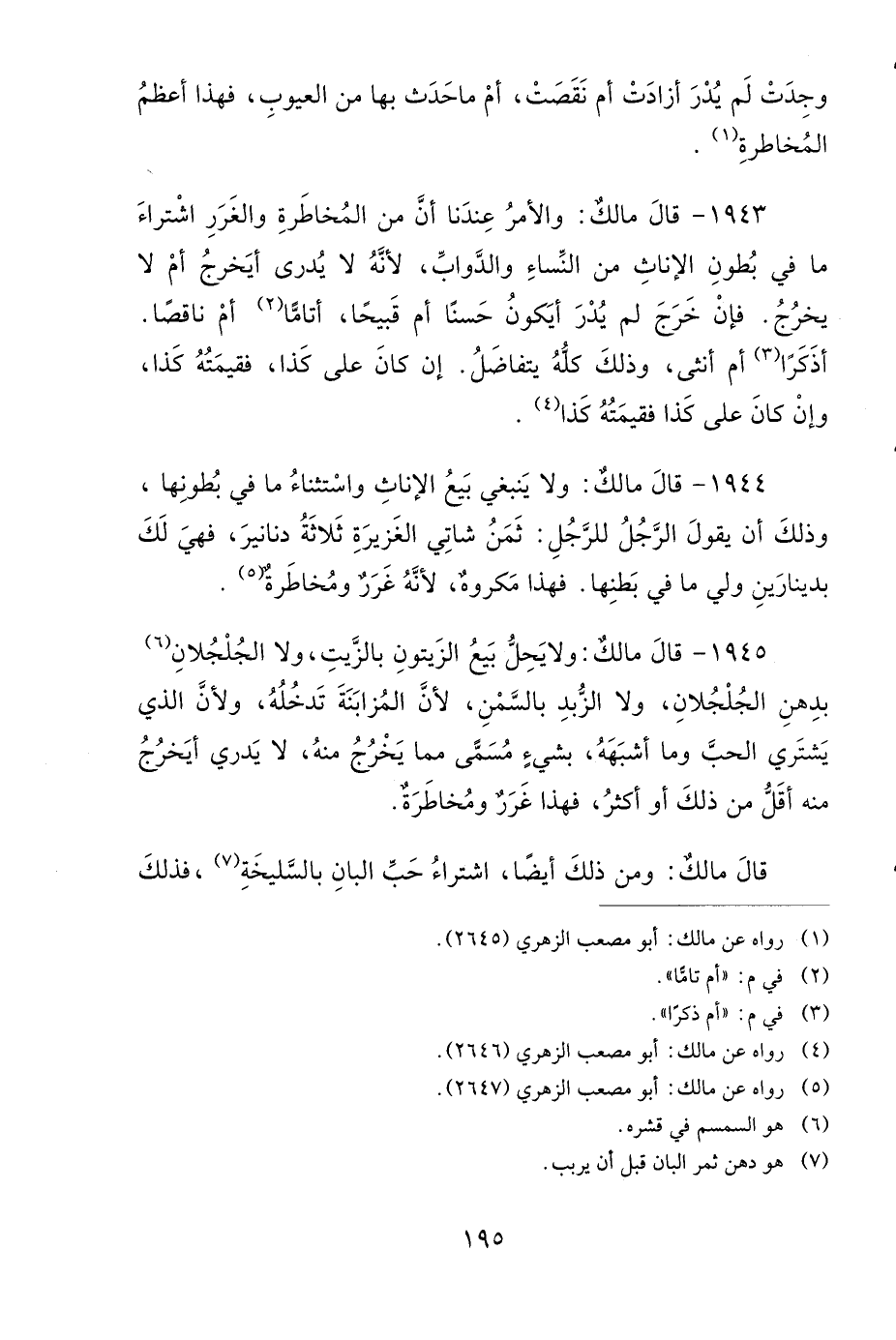 1943- قَالَ مَالِكٌ: وَالأَمْرُ عِنْدَنَا: أَنَّ مِنَ الْمُخَاطَرَةِ وَالْغَرَرِ اشْتِرَاءَ مَا فِي بُطُونِ الإِنَاثِ مِنَ النِّسَاءِ وَالدَّوَابِّ، لأَنَّهُ لاَ يُدْرَى أَيَخْرُجُ أَمْ لاَ يَخْرُجُ؟ فَإِنْ خَرَجَ لَمْ يُدْرَ أَيَكُونُ حَسَنًا أَمْ قَبِيحًا؟ أَمْ تَامًّا أَمْ نَاقِصًا؟ أَمْ ذَكَرًا أَمْ أُنْثَى؟ وَذَلِكَ كُلُّهُ يَتَفَاضَلُ، إِنْ كَانَ عَلَى كَذَا، فَقِيمَتُهُ كَذَا، وَإِنْ كَانَ عَلَى كَذَا، فَقِيمَتُهُ كَذَا.