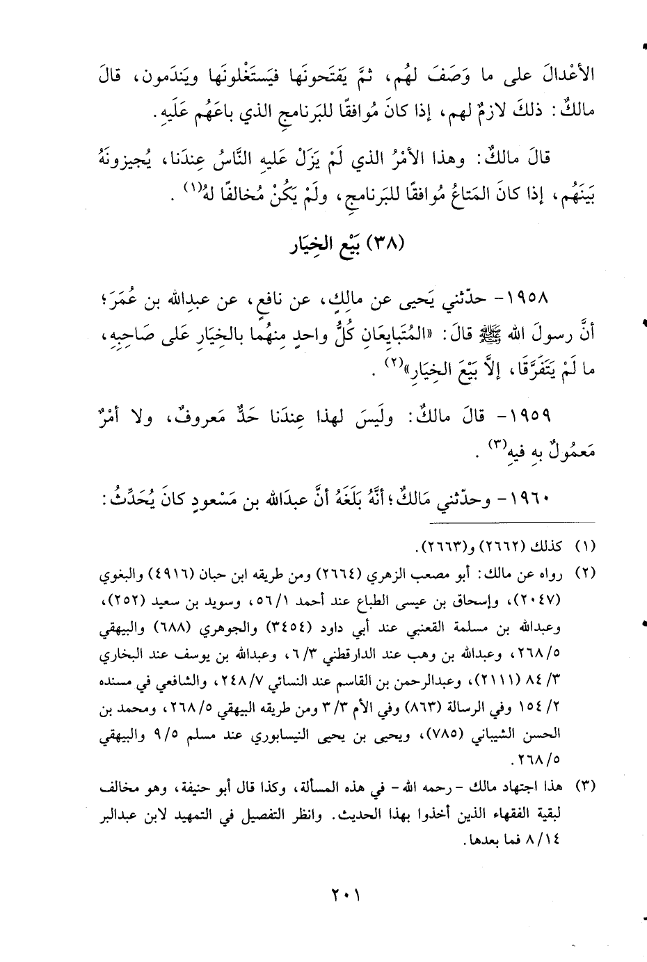 1958- حَدَّثَنِي يَحْيَى، عَنْ مَالِكٍ (1)، عَنْ نَافِعٍ، عَنْ عَبْدِ اللهِ بْنِ عُمَرَ؛ أَنَّ رَسُولَ اللهِ صَلى الله عَلَيهِ وَسَلمَ قَالَ: الْمُتَبَايِعَانِ كُلُّ وَاحِدٍ مِنْهُمَا بِالْخِيَارِ عَلَى صَاحِبِهِ، مَا لَمْ يَتَفَرَّقَا، إِلاَّ بَيْعَ الْخِيَارِ.