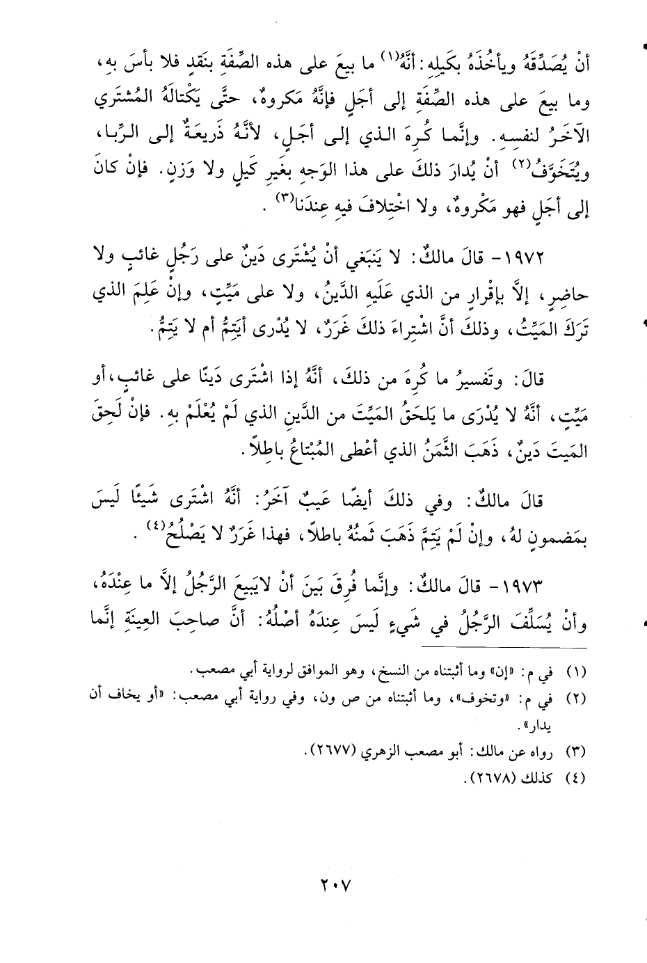 1972- قَالَ مَالِكٌ: لاَ يَنْبَغِي أَنْ يُشْتَرَى دَيْنٌ عَلَى رَجُلٍ غَائِبٍ، وَلاَ حَاضِرٍ، إِلاَّ بِإِقْرَارٍ مِنِ الَّذِي عَلَيْهِ الدَّيْنُ، وَلاَ عَلَى مَيِّتٍ، وَإِنْ عَلِمَ الَّذِي تَرَكَ الْمَيِّتُ، وَذَلِكَ أَنَّ اشْتِرَاءَ ذَلِكَ غَرَرٌ، لاَ يُدْرَى أَيَتِمُّ أَمْ لاَ يَتِمُّ؟.