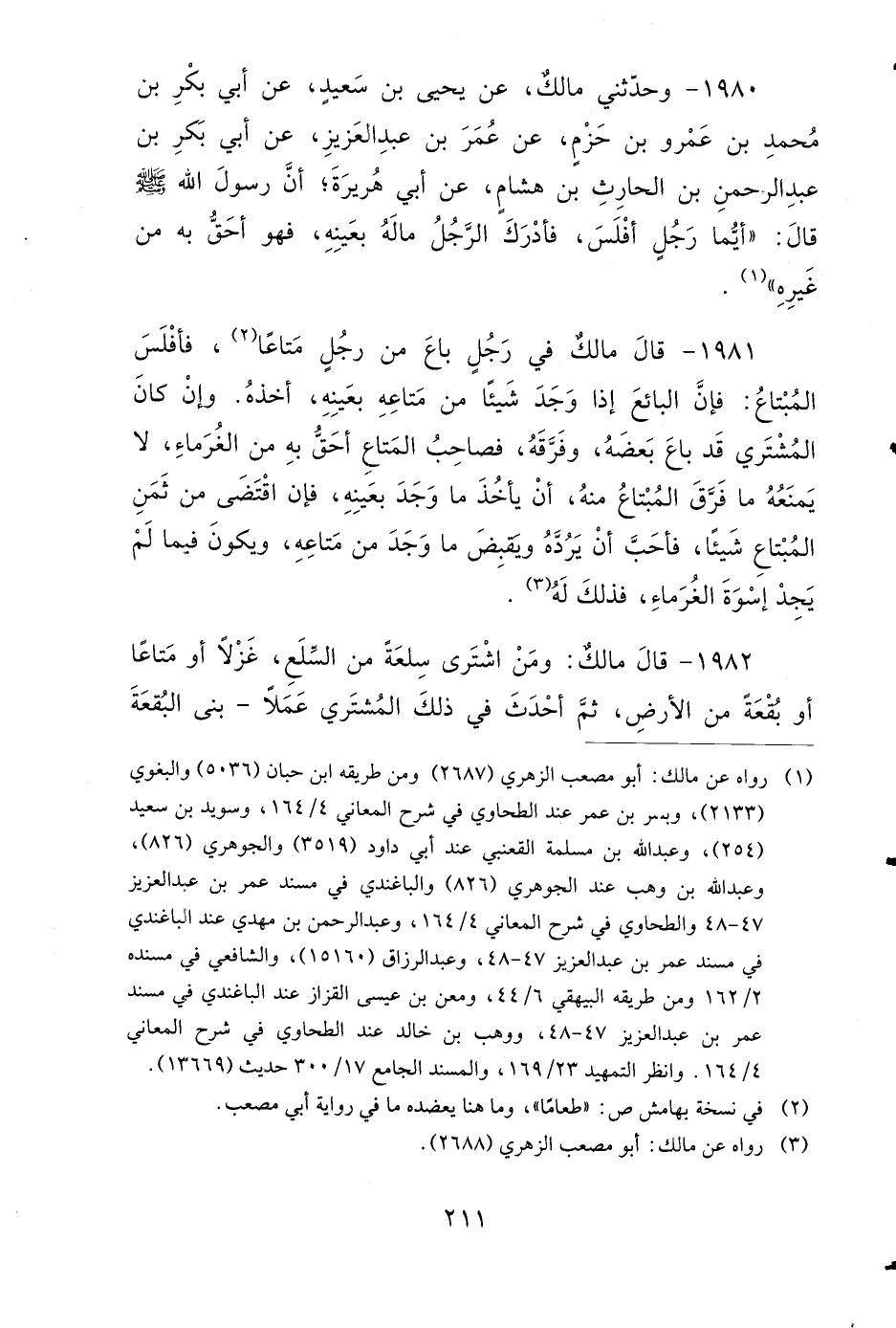 1980- وَحَدَّثَنِي مَالِكٌ، عَنْ يَحْيَى بْنِ سَعِيدٍ، عَنْ أَبِي بَكْرِ بْنِ مُحَمَّدِ بْنِ عَمْرِو بْنِ حَزْمٍ، عَنْ عُمَرَ بْنِ عَبْدِ الْعَزِيزِ، عَنْ أَبِي بَكْرِ بْنِ عَبْدِ الرَّحْمَنِ بْنِ الْحَارِثِ بْنِ هِشَامٍ، عَنْ أَبِي هُرَيْرَةَ، أَنَّ رَسُولَ اللهِ صَلى الله عَلَيهِ وَسَلمَ قَالَ: أَيُّمَا رَجُلٍ أَفْلَسَ، فَأَدْرَكَ الرَّجُلُ مَالَهُ بِعَيْنِهِ، فَهُوَ أَحَقُّ بِهِ مِنْ غَيْرِهِ.