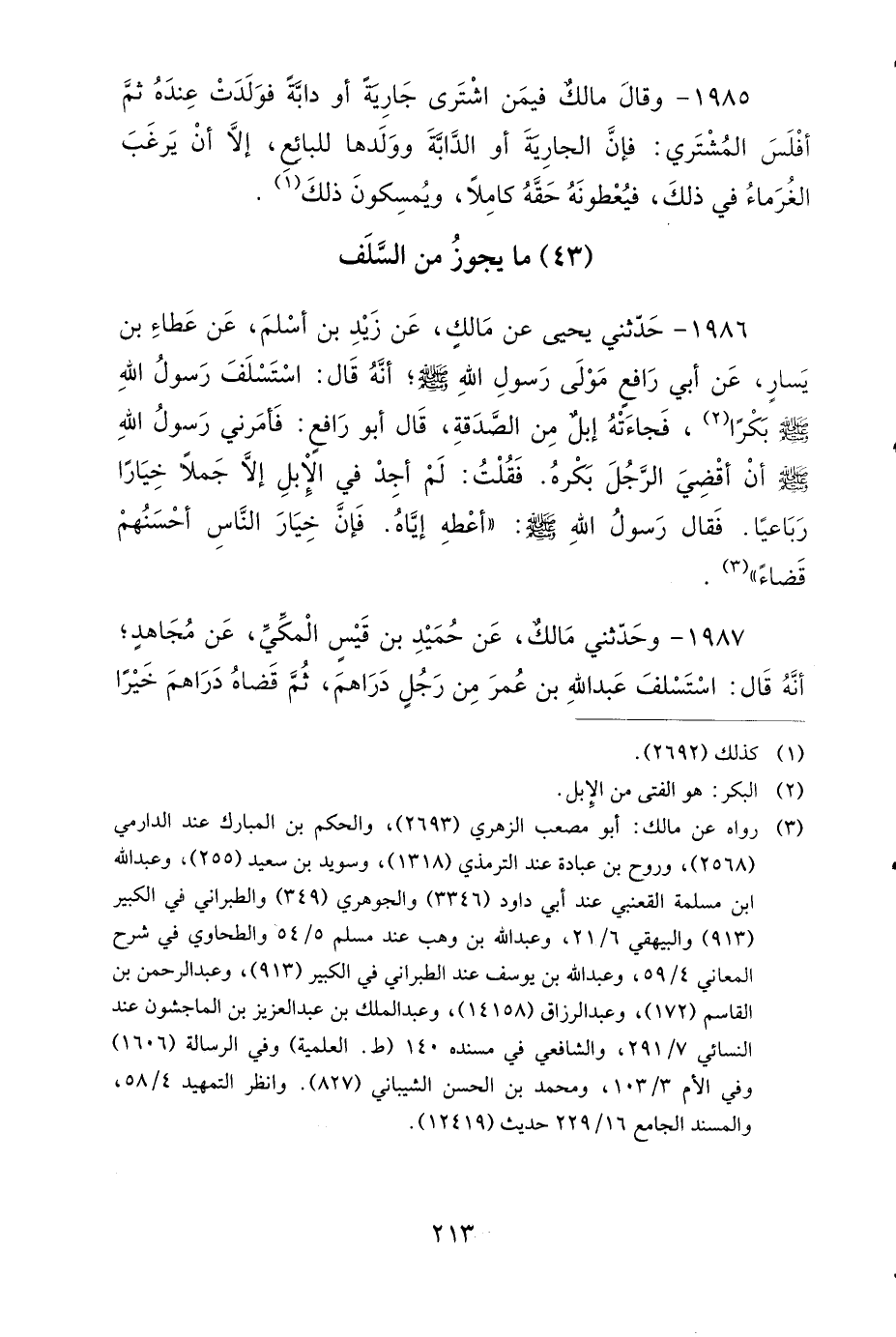 1986- حَدَّثَنِي يَحْيَى، عَنْ مَالِكٍ، عَنْ زَيْدِ بْنِ أَسْلَمَ، عَنْ عَطَاءِ بْنِ يَسَارٍ، عَنْ أَبِي رَافِعٍ، مَوْلَى رَسُولِ اللهِ صَلى الله عَلَيهِ وَسَلمَ، أَنَّهُ قَالَ: اسْتَسْلَفَ رَسُولُ اللهِ صَلى الله عَلَيهِ وَسَلمَ بَكْرًا، فَجَاءَتْهُ إِبِلٌ مِنَ الصَّدَقَةِ، قَالَ أَبُو رَافِعٍ: فَأَمَرَنِي رَسُولُ اللهِ صَلى الله عَلَيهِ وَسَلمَ أَنْ أَقْضِيَ الرَّجُلَ بَكْرَهُ، فَقُلْتُ: لَمْ أَجِدْ فِي الإِبِلِ إِلاَّ جَمَلاً خِيَارًا رَبَاعِيًا، فَقَالَ رَسُولُ اللهِ صَلى الله عَلَيهِ وَسَلمَ: أَعْطِهِ إِيَّاهُ، فَإِنَّ خِيَارَ النَّاسِ أَحْسَنُهُمْ قَضَاءً.