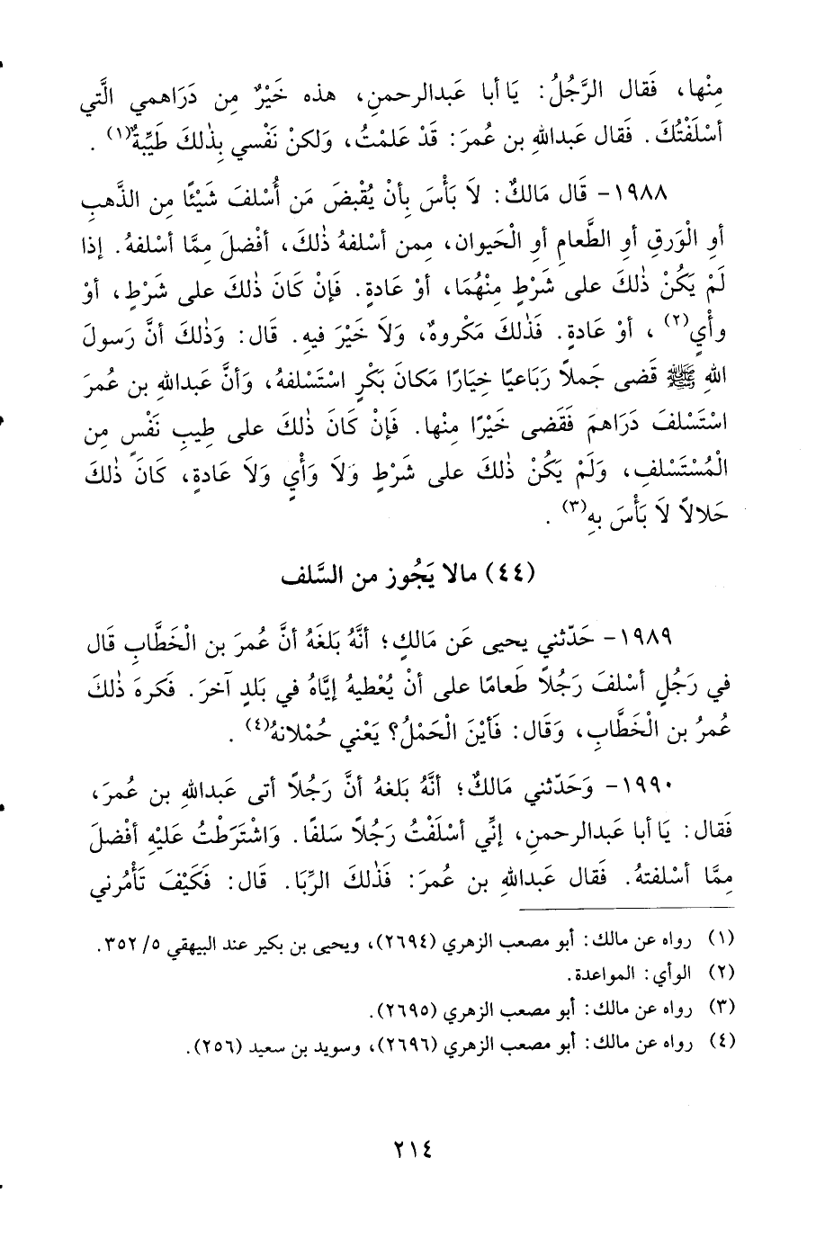1990- وَحَدَّثَنِي عَنْ مَالِكٍ؛ أَنَّهُ بَلَغَهُ، أَنَّ رَجُلاً أَتَى عَبْدَ اللهِ بْنَ عُمَرَ فَقَالَ: يَا أَبَا عَبْدِ الرَّحْمَنِ، إِنِّي أَسْلَفْتُ رَجُلاً سَلَفًا، وَاشْتَرَطْتُ عَلَيْهِ أَفْضَلَ مِمَّا أَسْلَفْتُهُ، فَقَالَ عَبْدُ اللهِ بْنُ عُمَرَ: فَذَلِكَ الرِّبَا، قَالَ: فَكَيْفَ تَأْمُرُنِي يَا أَبَا عَبْدِ الرَّحْمَنِ؟ فَقَالَ عَبْدُ اللهِ: السَّلَفُ عَلَى ثَلاَثَةِ وُجُوهٍ: سَلَفٌ تُسْلِفُهُ تُرِيدُ بِهِ وَجْهَ اللهِ، فَلَكَ وَجْهُ اللهِ، وَسَلَفٌ تُسْلِفُهُ تُرِيدُ بِهِ وَجْهَ صَاحِبِكَ، فَلَكَ وَجْهُ صَاحِبِكَ، وَسَلَفٌ تُسْلِفُهُ لِتَأْخُذَ خَبِيثًا بِطَيِّبٍ، فَذَلِكَ الرِّبَا، قَالَ: فَكَيْفَ تَأْمُرُنِي يَا أَبَا عَبْدِ الرَّحْمَنِ؟ قَالَ: أَرَى أَنْ تَشُقَّ الصَّحِيفَةَ، فَإِنْ أَعْطَاكَ مِثْلَ الَّذِي أَسْلَفْتَهُ قَبِلْتَهُ، وَإِنْ أَعْطَاكَ دُونَ الَّذِي أَسْلَفْتَهُ، فَأَخَذْتَهُ أُجِرْتَ، وَإِنْ أَعْطَاكَ أَفْضَلَ مِمَّا أَسْلَفْتَهُ طَيِّبَةً بِهِ نَفْسُهُ، فَذَلِكَ شُكْرٌ شَكَرَهُ لَكَ، وَلَكَ أَجْرُ مَا أَنْظَرْتَهُ.