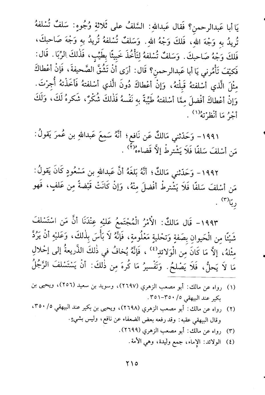 1992- وَحَدَّثَنِي مَالِكٌ؛ أَنَّهُ بَلَغَهُ، أَنَّ عَبْدَ اللهِ بْنَ مَسْعُودٍ كَانَ يَقُولُ: مَنْ أَسْلَفَ سَلَفًا فَلاَ يَشْتَرِطْ أَفْضَلَ مِنْهُ، وَإِنْ كَانَتْ قَبْضَةً مِنْ عَلَفٍ فَهُوَ رِبًا.