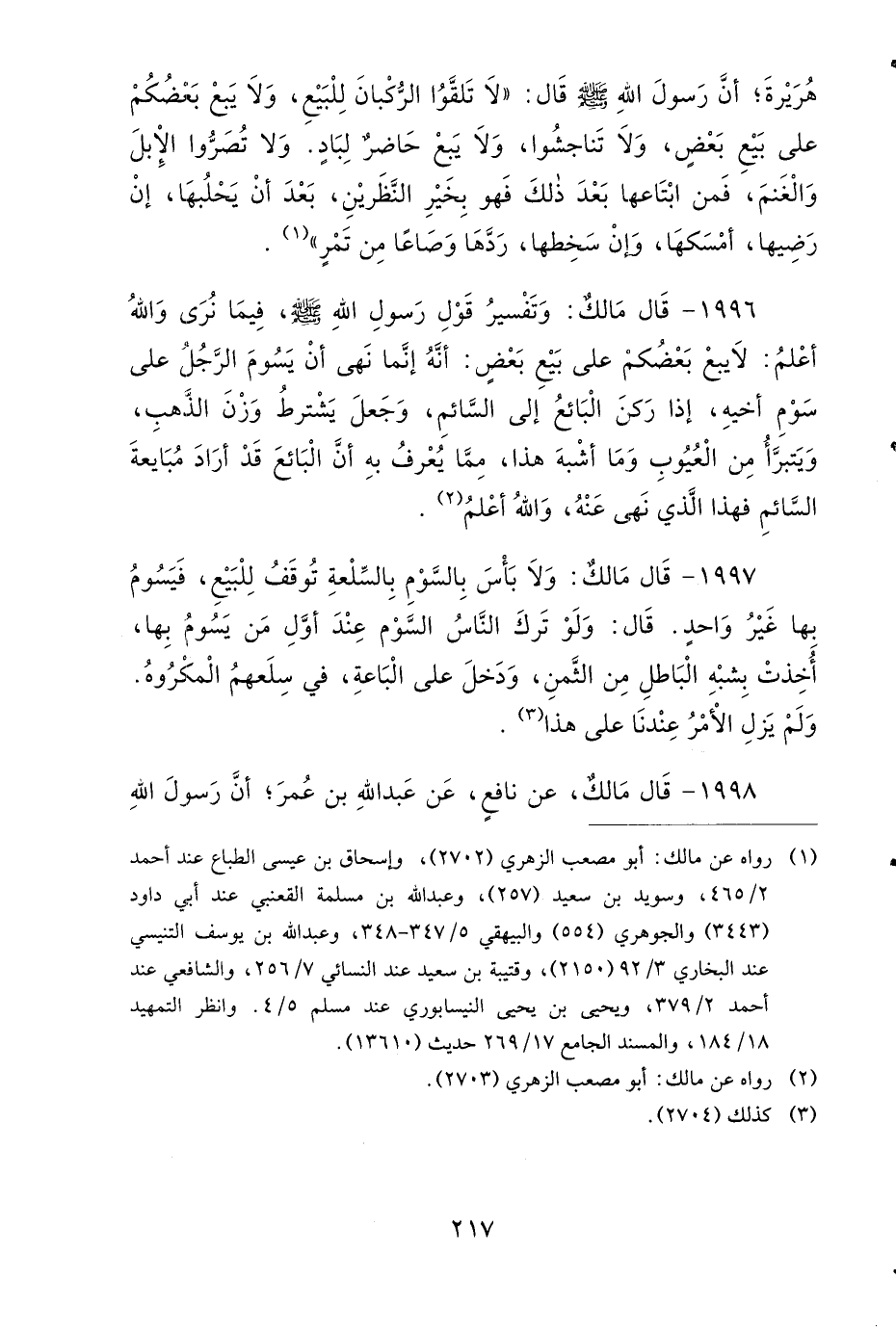 1996- قَالَ مَالِكٌ: وَتَفْسِيرُ قَوْلِ رَسُولِ اللهِ صَلى الله عَلَيهِ وَسَلمَ، فِيمَا نُرَى، وَاللهُ أَعْلَمُ، لاَ يَبِعْ بَعْضُكُمْ عَلَى بَيْعِ بَعْضٍ، أَنَّهُ إِنَّمَا نَهَى أَنْ يَسُومَ الرَّجُلُ عَلَى سَوْمِ أَخِيهِ، إِذَا رَكَنَ الْبَائِعُ إِلَى السَّائِمِ، وَجَعَلَ يَشْتَرِطُ وَزْنَ الذَّهَبِ، وَيَتَبَرَّأُ مِنَ الْعُيُوبِ، وَمَا أَشْبَهَ هَذَا مِمَّا يُعْرَفُ بِهِ، أَنَّ الْبَائِعَ قَدْ أَرَادَ مُبَايَعَةَ السَّائِمِ، فَهَذَا الَّذِي نَهَى عَنْهُ، وَاللهُ أَعْلَمُ.