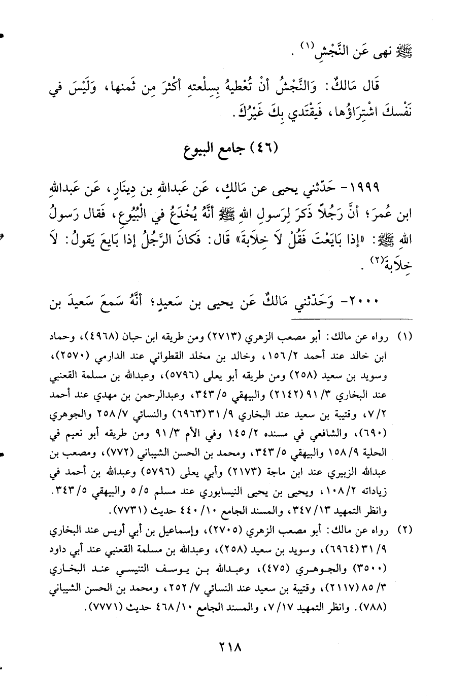 1999- حَدَّثَنِي يَحْيَى، عَنْ مَالِكٍ (1)، عَنْ عَبْدِ اللهِ بْنِ دِينَارٍ، عَنْ عَبْدِ اللهِ بْنِ عُمَرَ؛ أَنَّ رَجُلاً ذَكَرَ لِرَسُولِ اللهِ صَلى الله عَلَيهِ وَسَلمَ أَنَّهُ يُخْدَعُ فِي الْبُيُوعِ، فَقَالَ رَسُولُ اللهِ صَلى الله عَلَيهِ وَسَلمَ: إِذَا بَايَعْتَ فَقُلْ: لاَ خِلاَبَةَ، قَالَ: فَكَانَ الرَّجُلُ إِذَا بَايَعَ يَقُولُ: لاَ خِلاَبَةَ.