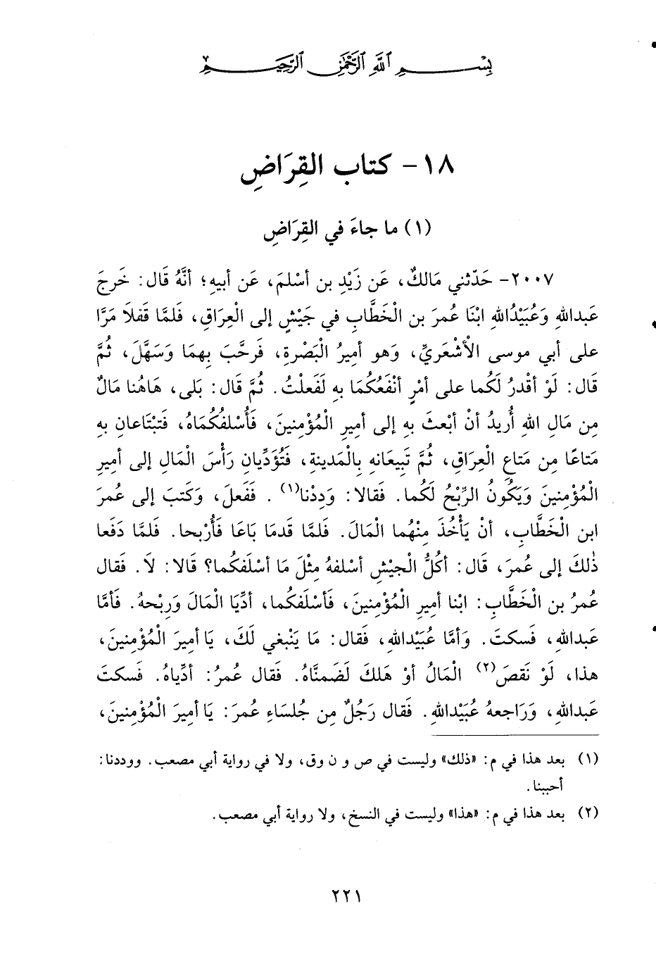 2007 - حَدَّثَنِي مَالِكٌ، عَنْ زَيْدِ بْنِ أَسْلَمَ، عَنْ أَبِيهِ، أَنَّهُ قَالَ: خَرَجَ عَبْدُ اللهِ، وَعُبَيْدُ اللهِ، ابْنَا عُمَرَ بْنِ الْخَطَّابِ فِي جَيْشٍ إِلَى الْعِرَاقِ، فَلَمَّا قَفَلاَ مَرَّا عَلَى أَبِي مُوسَى الأَشْعَرِيِّ، وَهُوَ أَمِيرُ الْبَصْرَةِ، فَرَحَّبَ بِهِمَا وَسَهَّلَ، ثُمَّ قَالَ: لَوْ أَقْدِرُ لَكُمَا عَلَى أَمْرٍ أَنْفَعُكُمَا بِهِ لَفَعَلْتُ، ثُمَّ قَالَ: بَلَى هَاهُنَا مَالٌ مِنْ مَالِ اللهِ، أُرِيدُ أَنْ أَبْعَثَ بِهِ إِلَى أَمِيرِ الْمُؤْمِنِينَ، فَأُسْلِفُكُمَاهُ، فَتَبْتَاعَانِ بِهِ مَتَاعًا مِنْ مَتَاعِ الْعِرَاقِ، ثُمَّ تَبِيعَانِهِ بِالْمَدِينَةِ، فَتُؤَدِّيَانِ رَأْسَ الْمَالِ إِلَى أَمِيرِ الْمُؤْمِنِينَ، وَيَكُونُ الرِّبْحُ لَكُمَا، فَقَالاَ: وَدِدْنَا، فَفَعَلَ، وَكَتَبَ إِلَى عُمَرَ بْنِ الْخَطَّابِ، أَنْ يَأْخُذَ مِنْهُمَا الْمَالَ، فَلَمَّا قَدِمَا بَاعَا، فَأُرْبِحَا، فَلَمَّا دَفَعَا ذَلِكَ إِلَى عُمَرَ، قَالَ: أَكُلُّ الْجَيْشِ أَسْلَفَهُ مِثْلَ مَا أَسْلَفَكُمَا؟ قَالاَ: لاَ، فَقَالَ عُمَرُ بْنُ الْخَطَّابِ: ابْنَا أَمِيرِ الْمُؤْمِنِينَ، فَأَسْلَفَكُمَا، أَدِّيَا الْمَالَ وَرِبْحَهُ، فَأَمَّا عَبْدُ اللهِ، فَسَكَتَ، وَأَمَّا عُبَيْدُ اللهِ، فَقَالَ: مَا يَنْبَغِي لَكَ يَا أَمِيرَ الْمُؤْمِنِينَ، هَذَا، لَوْ نَقَصَ هَذَا الْمَالُ أَوْ هَلَكَ لَضَمِنَّاهُ؟ فَقَالَ عُمَرُ: أَدِّيَاهُ، فَسَكَتَ عَبْدُ اللهِ، وَرَاجَعَهُ عُبَيْدُ اللهِ، فَقَالَ رَجُلٌ مِنْ جُلَسَاءِ عُمَرَ: يَا أَمِيرَ الْمُؤْمِنِينَ، لَوْ جَعَلْتَهُ قِرَاضًا؟ فَقَالَ عُمَرُ: قَدْ جَعَلْتُهُ قِرَاضًا، فَأَخَذَ عُمَرُ رَأْسَ الْمَالِ وَنِصْفَ رِبْحِهِ، وَأَخَذَ عَبْدُ اللهِ، وَعُبَيْدُ اللهِ، ابْنَا عُمَرَ بْنِ الْخَطَّابِ نِصْفَ رِبْحِ الْمَالِ.
