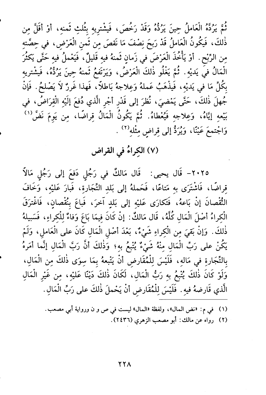 2025- قَالَ يَحْيَى: قَالَ مَالِكٌ فِي رَجُلٍ دَفَعَ إِلَى رَجُلٍ مَالاً قِرَاضًا، فَاشْتَرَى بِهِ مَتَاعًا، فَحَمَلَهُ إِلَى بَلَدِ التِّجَارَةِ، فَبَارَ عَلَيْهِ، وَخَافَ النُّقْصَانَ إِنْ بَاعَهُ، فَتَكَارَى عَلَيْهِ إِلَى بَلَدٍ آخَرَ، فَبَاعَ بِنُقْصَانٍ، فَاغْتَرَقَ الْكِرَاءُ أَصْلَ الْمَالِ كُلَّهُ، قَالَ مَالِكٌ: إِنْ كَانَ فِيمَا بَاعَ وَفَاءٌ لِلْكِرَاءِ، فَسَبِيلُهُ ذَلِكَ، وَإِنْ بَقِيَ مِنَ الْكِرَاءِ شَيْءٌ بَعْدَ أَصْلِ الْمَالِ، كَانَ عَلَى الْعَامِلِ، وَلَمْ يَكُنْ عَلَى رَبِّ الْمَالِ مِنْهُ شَيْءٌ يُتْبَعُ بِهِ، وَذَلِكَ أَنَّ رَبَّ الْمَالِ إِنَّمَا أَمَرَهُ بِالتِّجَارَةِ فِي مَالِهِ، فَلَيْسَ لِلْمُقَارَضِ أَنْ يَتْبَعَهُ بِمَا سِوَى ذَلِكَ مِنَ الْمَالِ، وَلَوْ كَانَ ذَلِكَ يُتْبَعُ بِهِ رَبُّ الْمَالِ، لَكَانَ ذَلِكَ دَيْنًا عَلَيْهِ، مِنْ غَيْرِ الْمَالِ الَّذِي قَارَضَهُ فِيهِ، فَلَيْسَ لِلْمُقَارَضِ أَنْ يَحْمِلَ ذَلِكَ عَلَى رَبِّ الْمَالِ.