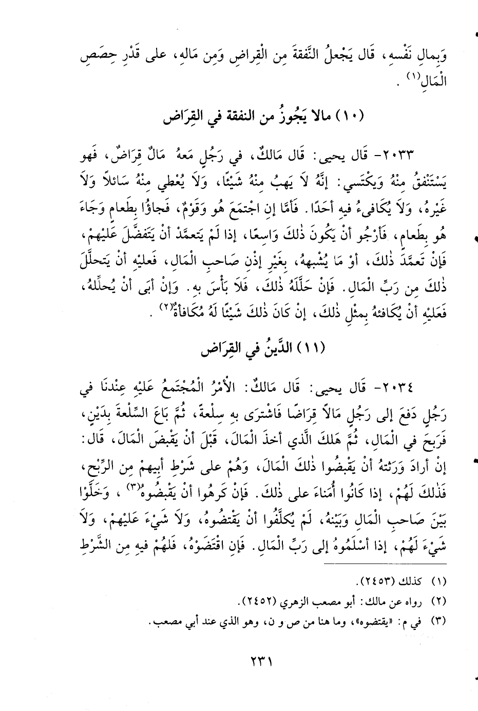 2033- قَالَ يَحْيَى: قَالَ مَالِكٌ فِي رَجُلٍ مَعَهُ مَالٌ قِرَاضٌ فَهُوَ يَسْتَنْفِقُ مِنْهُ، وَيَكْتَسِي: إِنَّهُ لاَ يَهَبُ مِنْهُ شَيْئًا، وَلاَ يُعْطِي مِنْهُ سَائِلاً، وَلاَ غَيْرَهُ، وَلاَ يُكَافِئُ فِيهِ أَحَدًا، فَأَمَّا إِنِ اجْتَمَعَ هُوَ وَقَوْمٌ فَجَاؤُوا بِطَعَامٍ، وَجَاءَ هُوَ بِطَعَامٍ، فَأَرْجُو أَنْ يَكُونَ ذَلِكَ وَاسِعًا، إِذَا لَمْ يَتَعَمَّدْ أَنْ يَتَفَضَّلَ عَلَيْهِمْ، فَإِنْ تَعَمَّدَ ذَلِكَ، أَوْ مَا يُشْبِهُهُ بِغَيْرِ إِذْنِ صَاحِبِ الْمَالِ، فَعَلَيْهِ أَنْ يَتَحَلَّلَ ذَلِكَ مِنْ رَبِّ الْمَالِ، فَإِنْ حَلَّلَهُ ذَلِكَ، فَلاَ بَأْسَ بِهِ، وَإِنْ أَبَى أَنْ يُحَلِّلَهُ، فَعَلَيْهِ أَنْ يُكَافِئَهُ بِمِثْلِ ذَلِكَ، إِنْ كَانَ ذَلِكَ شَيْئًا لَهُ مُكَافَأَةٌ.