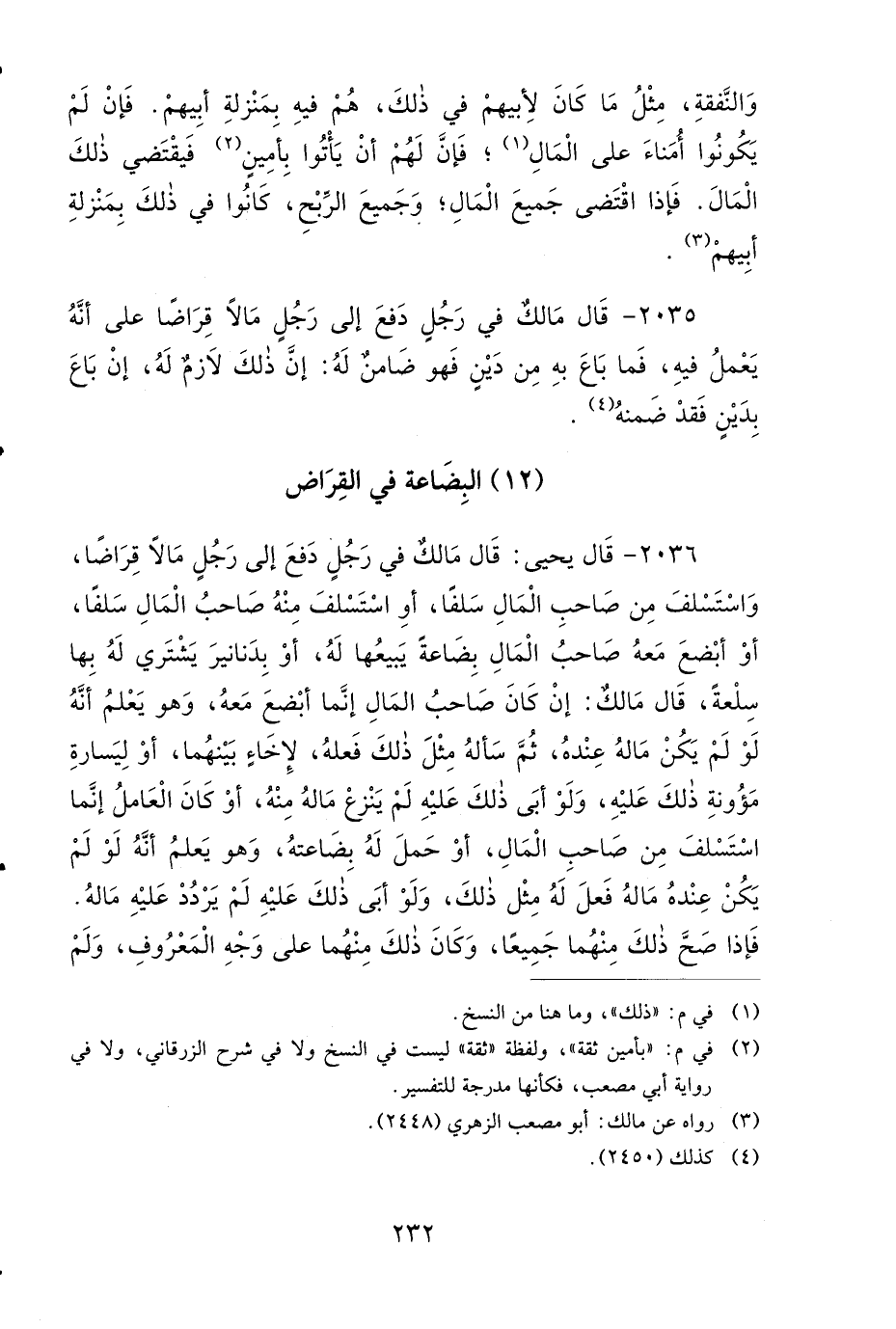 2036- قَالَ يَحْيَى: قَالَ مَالِكٌ فِي رَجُلٍ دَفَعَ إِلَى رَجُلٍ مَالاً قِرَاضًا، وَاسْتَسْلَفَ مِنْ صَاحِبِ الْمَالِ سَلَفًا، أَوِ اسْتَسْلَفَ مِنْهُ صَاحِبُ الْمَالِ سَلَفًا، أَوْ أَبْضَعَ مَعَهُ صَاحِبُ الْمَالِ بِضَاعَةً يَبِيعُهَا لَهُ، أَوْ بِدَنَانِيرَ يَشْتَرِي لَهُ بِهَا سِلْعَةً، قَالَ مَالِكٌ: إِنْ كَانَ صَاحِبُ الْمَالِ إِنَّمَا أَبْضَعَ مَعَهُ، وَهُوَ يَعْلَمُ أَنَّهُ لَوْ لَمْ يَكُنْ مَالُهُ عِنْدَهُ، ثُمَّ سَأَلَهُ مِثْلَ ذَلِكَ فَعَلَهُ، لإِخَاءٍ بَيْنَهُمَا، أَوْ لِيَسَارَةِ مَؤُونَةِ ذَلِكَ عَلَيْهِ، وَلَوْ أَبَى ذَلِكَ عَلَيْهِ لَمْ يَنْزِعْ مَالَهُ مِنْهُ، أَوْ كَانَ الْعَامِلُ إِنَّمَا اسْتَسْلَفَ مِنْ صَاحِبِ الْمَالِ، أَوْ حَمَلَ لَهُ بِضَاعَتَهُ، وَهُوَ يَعْلَمُ أَنَّهُ لَوْ لَمْ يَكُنْ عِنْدَهُ مَالُهُ فَعَلَ لَهُ مِثْلَ ذَلِكَ، وَلَوْ أَبَى ذَلِكَ عَلَيْهِ لَمْ يَرْدُدْ عَلَيْهِ مَالَهُ، فَإِذَا صَحَّ ذَلِكَ مِنْهُمَا جَمِيعًا، وَكَانَ ذَلِكَ مِنْهُمَا عَلَى وَجْهِ الْمَعْرُوفِ، وَلَمْ يَكُنْ شَرْطًا فِي أَصْلِ الْقِرَاضِ، فَذَلِكَ جَائِزٌ لاَ بَأْسَ بِهِ، وَإِنْ دَخَلَ ذَلِكَ شَرْطٌ، أوْ خِيفَ أَنْ يَكُونَ إِنَّمَا صَنَعَ ذَلِكَ الْعَامِلُ لِصَاحِبِ الْمَالِ، لِيُقِرَّ مَالَهُ فِي يَدَيْهِ، أَوْ إِنَّمَا صَنَعَ ذَلِكَ صَاحِبُ الْمَالِ، لأَنْ يُمْسِكَ الْعَامِلُ مَالَهُ، وَلاَ يَرُدَّهُ عَلَيْهِ، فَإِنَّ ذَلِكَ لاَ يَجُوزُ فِي الْقِرَاضِ، وَهُوَ مِمَّا يَنْهَى عَنْهُ أَهْلُ الْعِلْمِ.