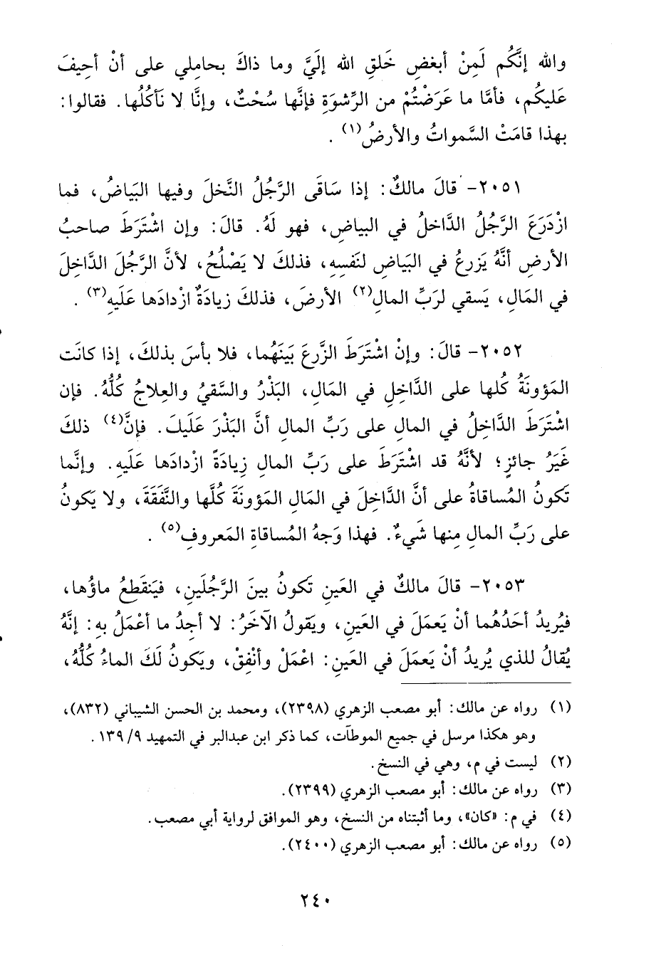 2052- قَالَ: وَإِنِ اشْتَرَطَ الزَّرْعَ بَيْنَهُمَا، فَلاَ بَأْسَ بِذَلِكَ، إِذَا كَانَتِ الْمَؤُونَةُ كُلُّهَا عَلَى الدَّاخِلِ فِي الْمَالِ: الْبَذْرُ، وَالسَّقْيُ، وَالْعِلاَجُ كُلُّهُ، فَإِنِ اشْتَرَطَ الدَّاخِلُ فِي الْمَالِ عَلَى رَبِّ الْمَالِ، أَنَّ الْبَذْرَ عَلَيْكَ، فَإِنَّ ذَلِكَ غَيْرُ جَائِزٍ، لأَنَّهُ قَدِ اشْتَرَطَ عَلَى رَبِّ الْمَالِ زِيَادَةً ازْدَادَهَا عَلَيْهِ، وَإِنَّمَا تَكُونُ الْمُسَاقَاةُ عَلَى أَنَّ الدَّاخِلَ فِي الْمَالِ: الْمَؤُونَةَ كُلَّهَا، وَالنَّفَقَةَ، وَلاَ يَكُونُ عَلَى رَبِّ الْمَالِ مِنْهَا شَيْءٌ، فَهَذَا وَجْهُ الْمُسَاقَاةِ الْمَعْرُوفُ.