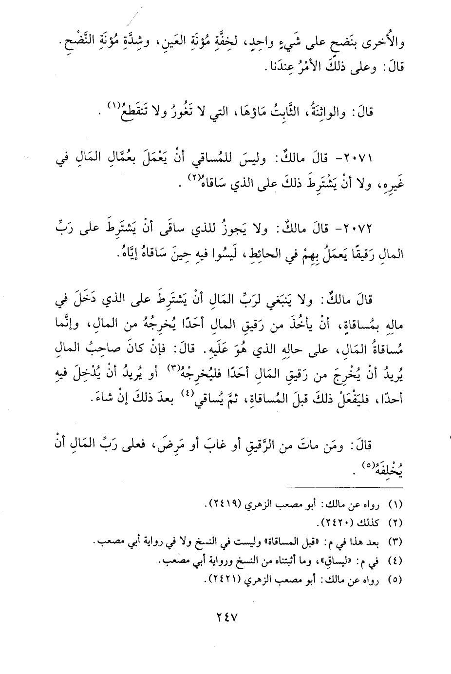 2072- قَالَ مَالِكٌ: وَلاَ يَجُوزُ لِلَّذِي سَاقَى أَنْ يَشْتَرِطَ عَلَى رَبِّ الْمَالِ رَقِيقًا يَعْمَلُ بِهِمْ فِي الْحَائِطِ، لَيْسُوا فِيهِ حِينَ سَاقَاهُ إِيَّاهُ، قَالَ مَالِكٌ: وَلاَ يَنْبَغِي لِرَبِّ الْمَالِ أَنْ يَشْتَرِطَ عَلَى الَّذِي دَخَلَ فِي مَالِهِ بِمُسَاقَاةٍ، أَنْ يَأْخُذَ مِنْ رَقِيقِ الْمَالِ أَحَدًا يُخْرِجُهُ مِنَ الْمَالِ، وَإِنَّمَا مُسَاقَاةُ الْمَالِ عَلَى حَالِهِ الَّذِي هُوَ عَلَيْهِ، قَالَ: فَإِنْ كَانَ صَاحِبُ الْمَالِ يُرِيدُ أَنْ يُخْرِجَ مِنْ رَقِيقِ الْمَالِ أَحَدًا، فَلْيُخْرِجْهُ، أَوْ يُرِيدُ أَنْ يُدْخِلَ فِيهِ أَحَدًا، فَلْيَفْعَلْ ذَلِكَ قَبْلَ الْمُسَاقَاةِ، ثُمَّ يُسَاقِي بَعْدَ ذَلِكَ إِنْ شَاءَ.